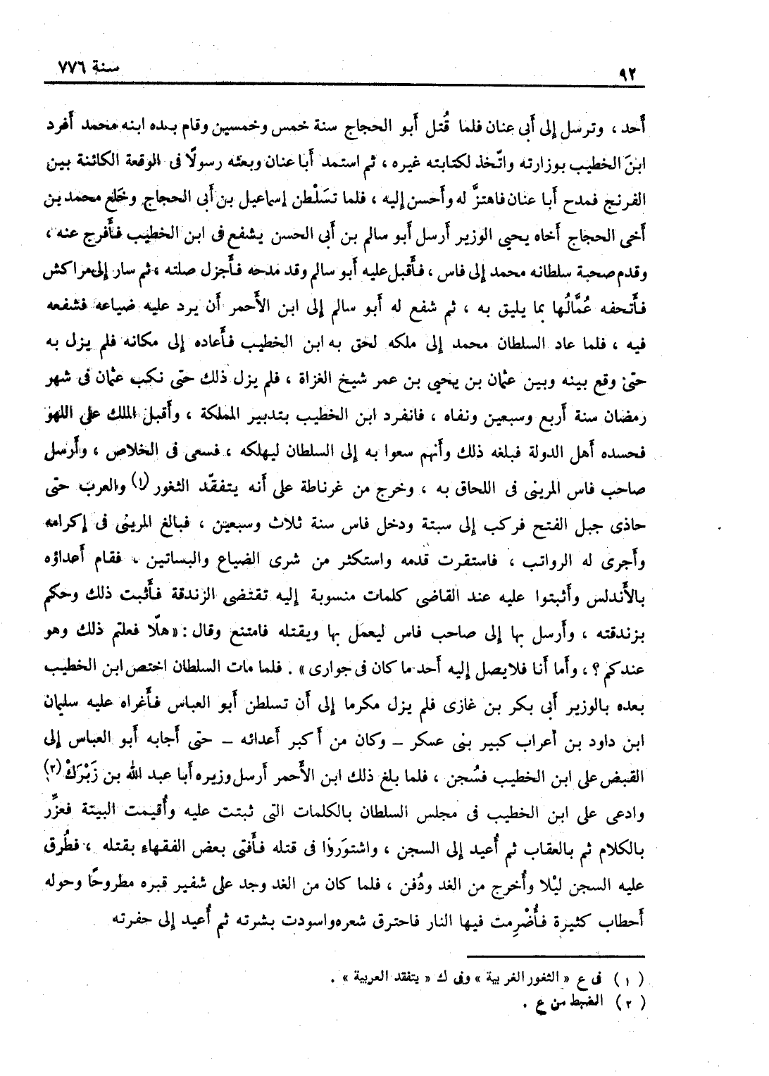 أحد، وترسل إلى أبي عنان، فلما قتل أبو الحجاج سنة خمس وخمسين وقام بعده ابنه محمد أفرد ابن الخطيب بوزارته، واتخذ لكتابته غيره ثم استمد أبا عنان وبعثه رسولاً في الوقعة الكائنة بين الفرنج، فمدح أبا عنان فاهتز له وأحسن إليه، فلما تسلطن إسماعيل بن أبي الحجاج وخلع محمد بن أبي الحجاج أخاه نحى الوزير فأرسل أبو سالم بن أبي الحسن فشفع في ابن الخطيب، فأفرج عنه وقدم صحبة سلطانه محمد إلى فاس، فأقبل عليه أبو سالم وقد مدحه، فأجزل صلته، ثم سار إلى مراكش فأتحفه عمالها بما يليق به، ثم شفع له أبو سالم إلى ابن الأحمر أن يرد عليه ضياعه فشفعه فيه، فلما عاد السلطان محمد إلى ملكه لحق به ابن الخطيب فأعاده إلى مكانه فلم يزل حتى وقع بينه وبين عثمان بن يحيى بن عمر شيخ الغزاة منافرة فلم يزل ذلك حتى نكب عثمان في شهر رمضان سنة أربع وسبعين ونفاه، فانفرد ابن الخطيب بتدبير المملكة، وأقبل الملك على اللهو فحسده أهل الدولة، فبلغه ذلك وأنهم سعوا به إلى السلطان ليهلكه، فسعى في الخلاص وراسل صاحب فاس المريني في اللحاق به، وخرج من غرناطة على انه يتفقد الثغور الغربية حتى حاذى جبل الفتح، فركب إلى سبتة ودخل فاس سنة ثلاث وسبعين، فبالغ المريني في إكرامه وأجرى له الرواتب، فاستقرت قدمه واستكثر من شرى الضياع والبساتين، فقام أعداؤه بالأندلس وأثبتوا عليه عند القاضي كلمات منسوبة إليه تقتضي الزندقة، فأثبت ذلك وحكم بزندقته وأرسل بها إلى صاحب فاس ليعمل بها ويقتله، فامتنع وقال: هلا فعلتم ذلك وهو عندكم! وأما أنا فلا يصل إليه أحد ما كان في جواري، فلما مات السلطان اختص ابن الخطيب بعده بالوزير أبي بكر بن غازي، فلم يزل مكرماً إلى أن تسلطن أبو العباس فأغراه به سليمان بن داود بن أعراب كبير بني عسكر، وكان من أكبر أعدائه حتى أجابه أبو العباس إلى القبض على ابن الخطيب فسجن، فلما بلغ ذلك ابن الأحمر أرسل وزيره أبا عبد الله بن زبرك وادعى على ابن الخطيب في مجلس السلطان بالكلمات التي ثبتت عليه وأقيمت البينة، فعزر بالكلام ثم بالعقاب ثم أعيد إلى السجن، واشتوروا في قلته فأفتى بعض الفقهاء بقتله، فطرق عليه السجن ليلاً وقتل في السجن ليلاً، وأخرج من الغد ودفن، فلما كان من الغد وجد على شفير قبره مطروحاً وحوله أحطاب كثيرة، فأضرمت فيها النار فاحترق شعره واسودت بشرته، ثم أعيد إلى حفرته،