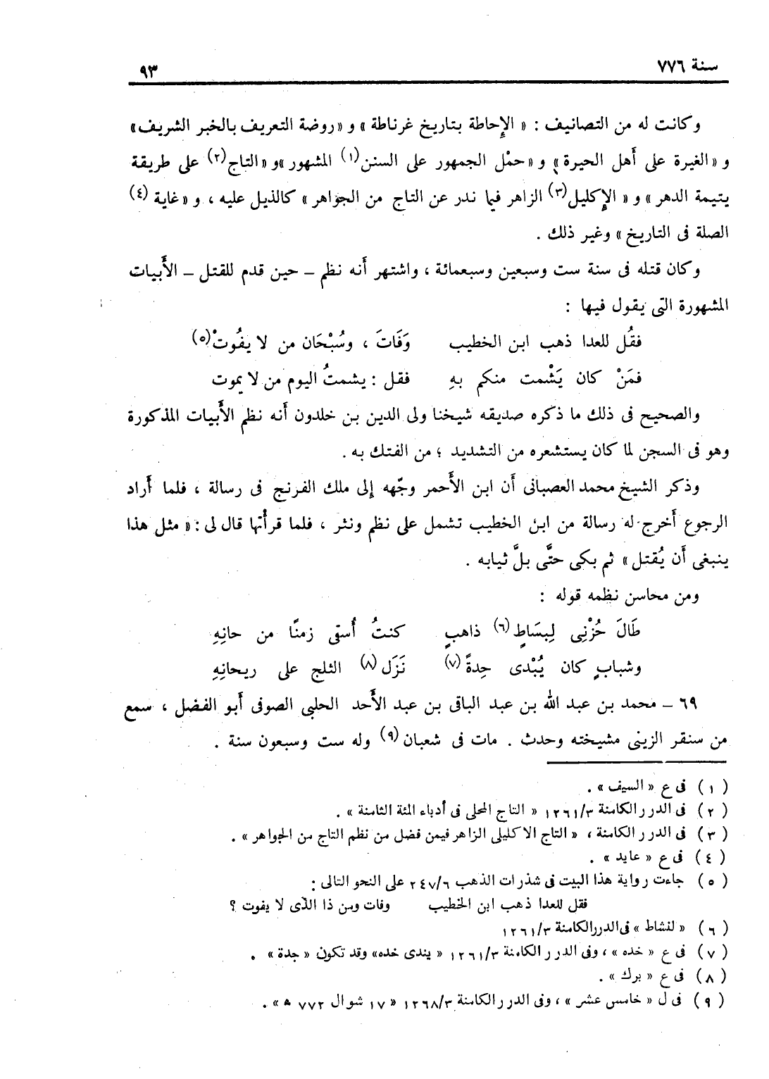 وكانت له من التصانيف الإحاطة بتاريخ غرناطة وروضة التعريف بالحب الشريف والغيرة على أهل الحيرة وحمل الجمهور على السنن المشهور والتاج على طريقة يتيمة الدهر والإكليل الزاهر فيما ندر عن التاج من الجواهر كالذيل عليه وعائد الصلة في التاريخ وغير ذلك، وكان قتله في سنة ست وسبعين وسبعمائة، واشتهر أنه نظم حين قدم للقتل الأبيات المشهورة التي يقول فيها:
