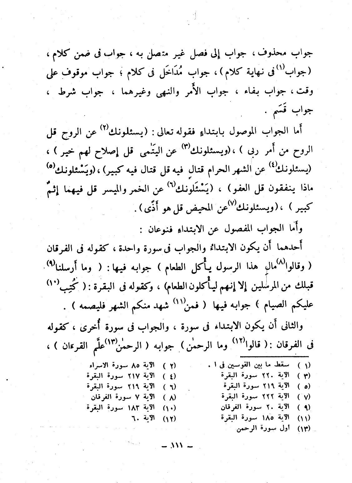 جواب محذوف، جواب إِلى فصل غير متصل به، جواب في ضمن كلام، (جواب في نهاية كلام) ، جواب مُدَاخَل في كلام؛ جواب موقوف على وقت، جواب بفاء، جواب الأَمر والنهي وغيرهما، جواب شرط، جواب قَسَم.