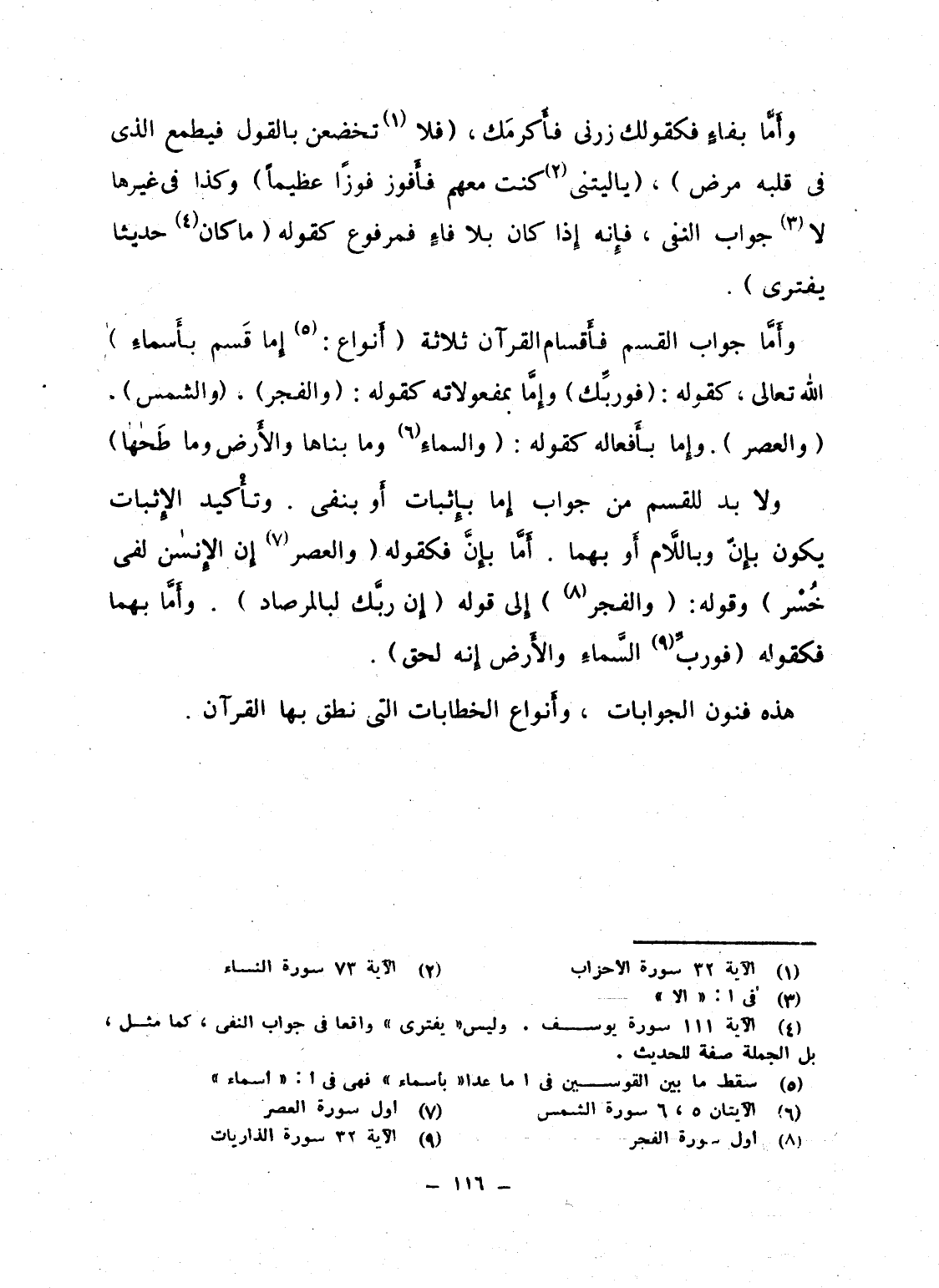 ولا بد للقسم من جواب إِما بإِثبات أَو بنفى. وتأْكيد الإِثبات يكون بإِنّ وباللاَّم أَو بهما. أَمَّا بإِنَّ فكقوله {والعصر إِنَّ الإنسان لَفِى خُسْرٍ} وقوله: {وَالفَجْرِ} إِلى قوله {إِنَّ رَبَّكَ لَبِالْمِرْصَاد} . وأَمَّا بهما فكقوله {فَوَرَبِّ السمآء والأرض إِنَّهُ لَحَقٌّ} .