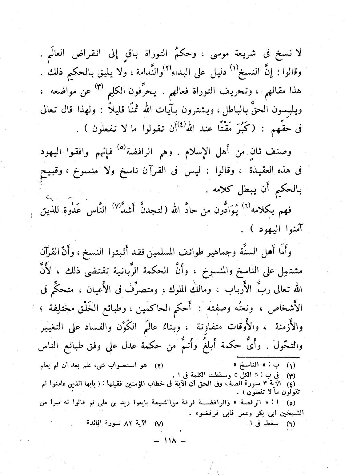 وصنف ثانٍ من أَهل الإِسلام. وهم الرافضة فإِنهم وافقوا اليهود فى هذه العقيدة، وقالوا: ليس فى القرآن ناسخ ولا منسوخ، وقبيح بالحكيم أَن يبطل كلامه.