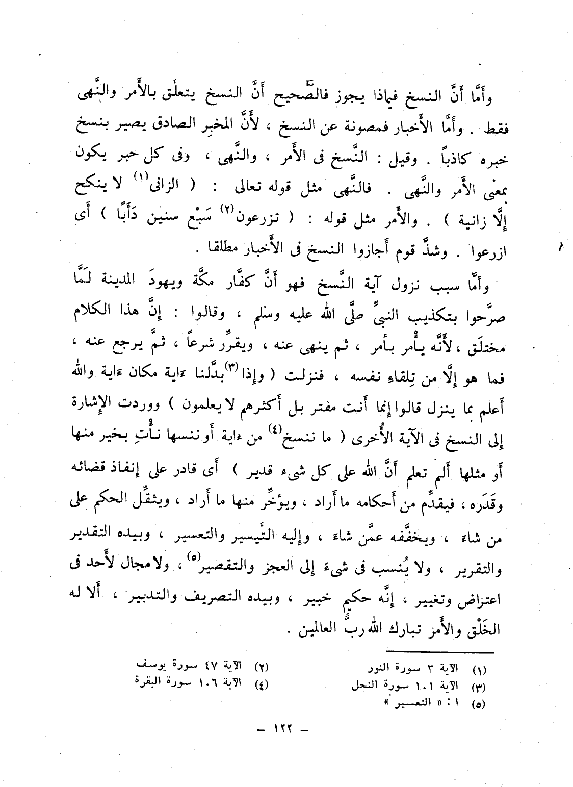 وأَمَّا سبب نزول آية النَّسخ فهو أَنَّ كفَّار مكَّة ويهودَ المدينة لَمَّا صرَّحوا بتكذيب النبىِّ صلَّى الله عليه وسلم، وقالوا: إِنَّ هذا الكلام مختلَق، لأَنَّه يأْمر بأمر، ثم ينهى عنه، ويقرِّر شرعاً، ثمَّ يرجع عنه، فما هو إِلاَّ من تِلقاءِ نفسه، فنزلت {وَإِذَا بَدَّلْنَآ آيَةً مَّكَانَ آيَةٍ والله أَعْلَمُ بِمَا يُنَزِّلُ قالوا إِنَّمَآ أَنتَ مُفْتَرٍ بَلْ أَكْثَرُهُمْ لاَ يَعْلَمُونَ} ووردت الإِشارة إِلى النسخ فى الآية الأُخرى {مَا نَنسَخْ مِنْ آيَةٍ أَوْ نُنسِهَا نَأْتِ بِخَيْرٍ مِّنْهَا أَوْ مِثْلِهَا أَلَمْ تَعْلَمْ أَنَّ الله على كُلِّ شَيْءٍ قَدِيرٌ} أَى قادر على إِنفاذ قضائه وقَدَره، فيقدِّم من أَحكامه ما أَراد، ويؤخِّر منها ما أَراد، ويثقِّل الحكم على من شاءَ، ويخفَّفه عمَّن شاءَ، وإِليه التَّيسير والتعسير، وبيده التقدير والتقرير، ولا يُنسب فى شىء إِلى العجز والتقصير، ولا مجال لأَحد فى اعتراض وتغيير، إِنَّه حكيم خبير، وبيده التصريف والتدبير، أَلا له الخَلْق والأَمر تبارك الله ربُّ العالمين.