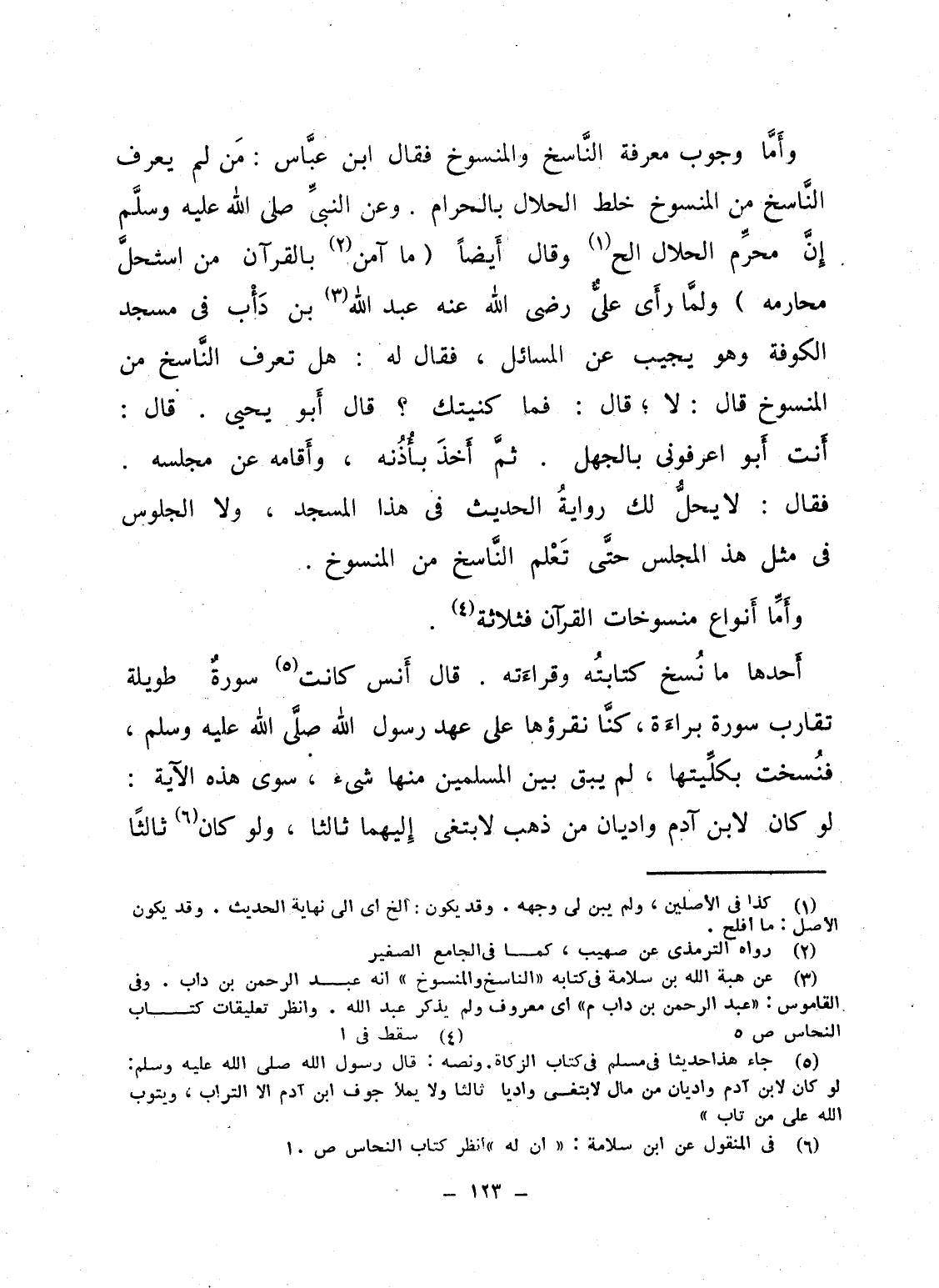 وأَمَّا وجوب معرفة النَّاسخ والمنسوخ فقال ابن عبَّاس: مَن لم يعرف النَّاسخ من المنسوخ خلط الحلال بالحرام. وعن النبىِّ صلى الله عليه وسلَّم أَنَّ محرِّم الحلال الخ وقال أَيضاً "ما آمن بالقرآن من استحلَّ محارمه" ولمَّا رأَى علىٌّ رضى الله عنه عبد الله بن دَأْب فى مسجد الكوفة وهو يجيب عن المسائل، فقال له: هل تعرف النَّاسخ من المنسوخ قال: لا؛ قال: فما كنيتك؟ قال أَبو يحيى. قال: أَنت أَبو اعرفونى بالجهل. ثمَّ أَخذَ بأُذُنه، وأَقامه عن مجلسه. فقال: لا يحلُّ لك روايةُ الحديث فى هذا المسجد، ولا الجلوس فى مثل هذا المجلس حتَّى تَعْلم النَّاسخ من المنسوخ.