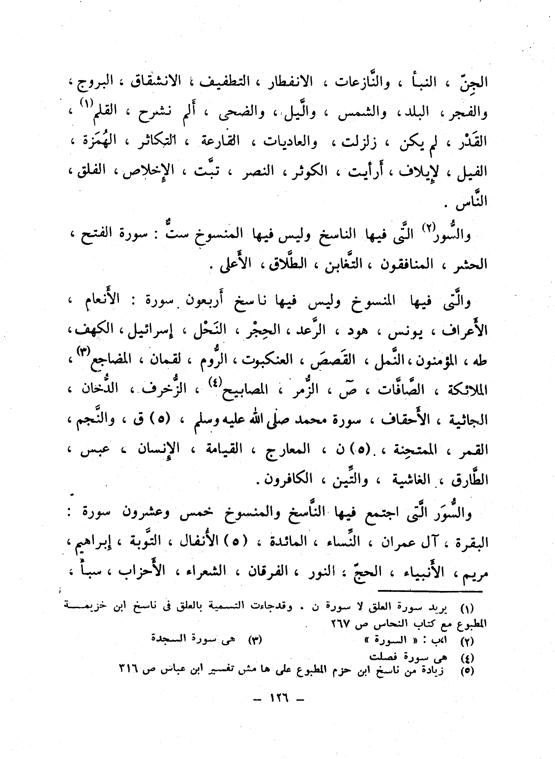 والَّتى فيها المنسوخ وليس فيها ناسخ أَربعون سورة: الأَنعام، الأَعراف، يونس، هود، الرَّعد، الحِجْر، النَحْل، إِسرائيل، الكهف، طه، المؤمنون، النَّمل، القَصصَ، العنكبوت، الرُّوم، لقمان، المضاجع، الملائكة، الصَّافَّات، ص، الزُّمر، المصابيح، الزُّخرف، الدُّخان، الجاثية، الأَحقاف، سورة محمد صلى الله عليه وسلم، (5) ق، والنَّجم، القمر، الممتحِنة، (5) ن، المعارج، القيامة، الإِنسان، عبس، الطَّارق، الغاشية، والتِّين، الكافرون.