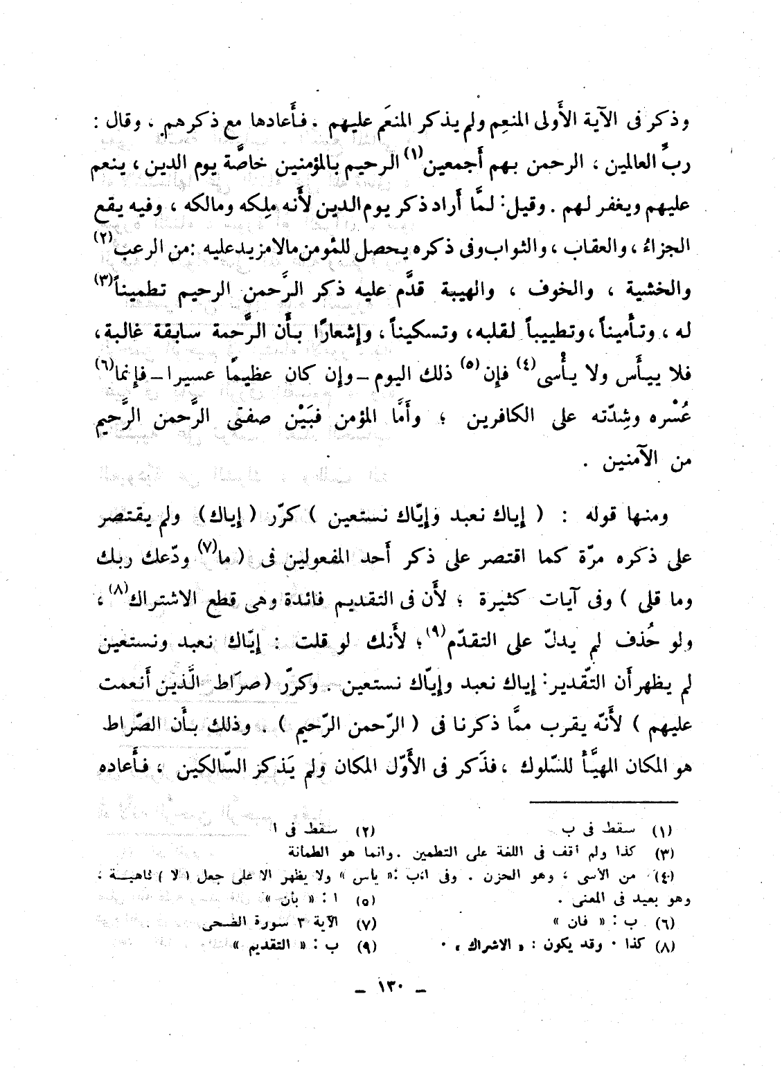 ومنها قوله: {إِيَّاكَ نَعْبُدُ وَإِيَّاكَ نَسْتَعِينُ} كرّر (إِياك) ولم يقتصر على ذكره مرّة كما اقتصر على ذكر أَحد المفعولين فى {مَا وَدَّعَكَ رَبُّكَ وَمَا قلى} وفى آيات كثيرة؛ لأَن فى التقديم فائدة وهى قطع الاشتراك، ولو حُذف لم يدلّ على التقدّم؛ لأَنك لو قلت: إِيّاك نعبد ونستعين لم يظهر أَن التّقدير: إِياك نعبد وإِيّاك نستعين. وكرّر {صِرَاطَ الذين أَنْعَمْتَ عَلَيْهِمْ} لأَنّه يقرب ممَّا ذكرنا فى {الرحمان الرحيم} . وذلك بأَن الصّراط هو المكان المهيَّأ للسّلوك، فذَكر فى الأَوّل المكان ولم يَذكر السّالكين، فأَعاده