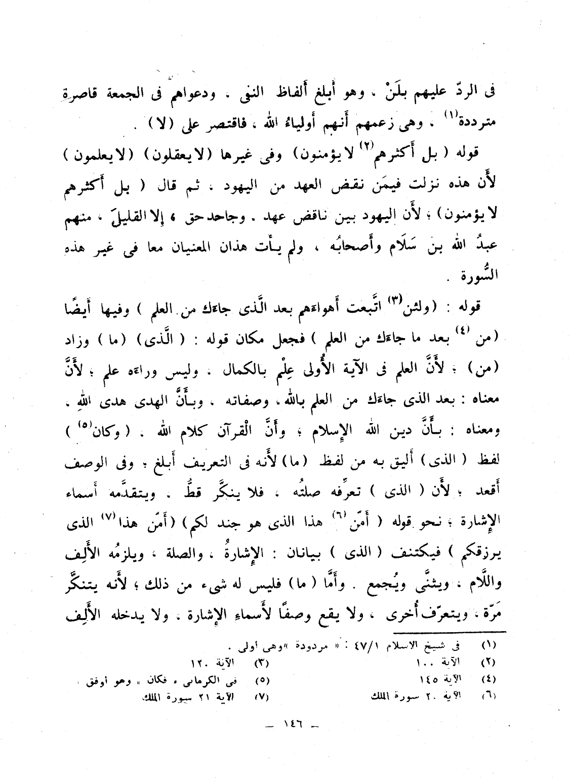 قوله: {وَلَئِنِ اتبعت أَهْوَآءَهُمْ بَعْدَ الذي جَآءَكَ مِنَ العلم} وفيها أَيضاً {مِنْ بَعْدَ الذي جَآءَكَ مِنَ العلم} فجعل مكان قوله: (الَّذى) (ما) وزاد (من) ؛ لأَنَّ العلم فى الآية الأُولى عِلْم بالكمال، وليس وراءَه علم؛ لأَنَّ معناه: بعد الذى جاءَك من العلم بالله، وصفاته، وبأَنّ الهدى هدى اللهِ، ومعناه: بأَنَّ دين الله الإِسلام؛ وأَنَّ الْقرآن كلام الله، (وكان) لفظ (الذى) أَليق به من لفظ (ما) لأَنه فى التعريف أَبلغ؛ وفى الوصف أَقعد؛ لأَن (الذى) تعرِّفه صلتُه، فلا ينكَّر قطٌّ، ويتقدَّمه أَسماء الإِشارة؛ نحو قوله {أَمَّنْ هاذا الذي هُوَ جُندٌ لَّكُمْ} {أَمَّنْ هاذا الذي يَرْزُقُكُمْ} فيكتنف (الَّذى) بيانان: الإِشارةُ، والصلة، ويلزمُه الأَلِف واللاَّم، ويثنَّى ويُجمع. وأَمَّا (ما) فليس له شىء من ذلك؛ لأَنه يتنكَّر مَرّة، ويتعرّف أُخرى، ولا يقع وصفاً لأَسماءِ الإِشارة، ولا يدخله الأَلِف