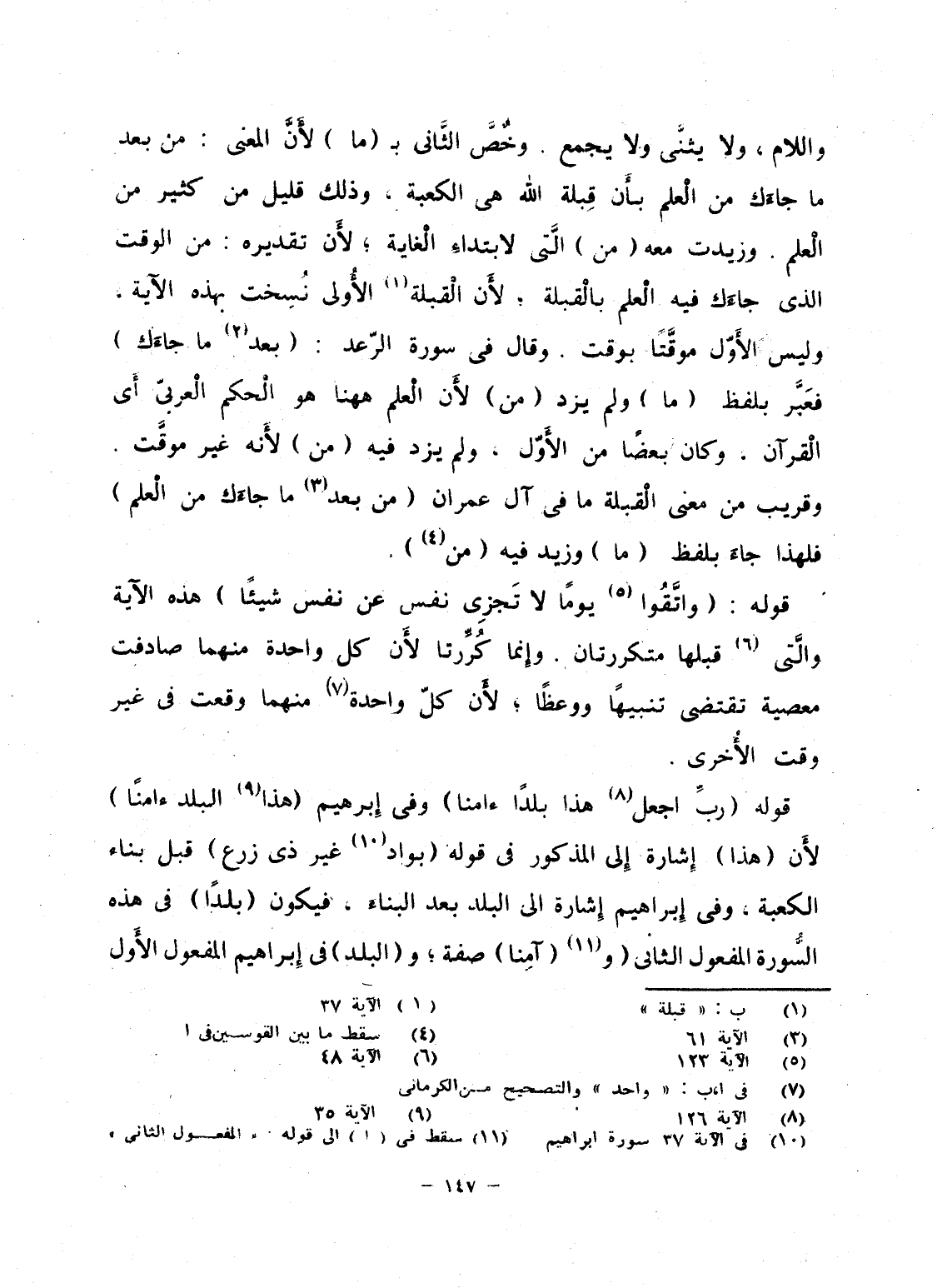 واللام، ولا يثنَّى ولا يجمع. وخُصَّ الثَّانى بـ (ما) لأَنَّ المعنى: من بعد ما جاءَك من الْعلم بأَن قِبلة الله هى الكعبة، وذلك قليل من كثير من الْعلم. وزيدت معه (من) الَّتى لابتداءِ الْغاية؛ لأَن تقديره: من الوقت الذى جاءَك فيه الْعلم بالْقبلة؛ لأَن الْقبلة الأُولى نُسِخت بهذه الآية، وليس الأَوّل موقَّتاً بوقت. وقال فى سورة الرّعد: {بَعْدَ مَا جَاءَكَ} فعَبَّر بلفظ (ما) ولم يزد (من) لأَن الْعلم هاهنا هو الْحكم الْعربىّ أَى الْقرآن، وكان بعضاً من الأَوّل، ولم يزد فيه (من) لأَنه غير موقَّت. وقريب من معنى الْقبلة ما فى آل عمران {مِن بَعْدِ مَا جَآءَكَ مِنَ العلم} فلهذا جاءَ بلفظ (ما) وزيد فيه (من) .