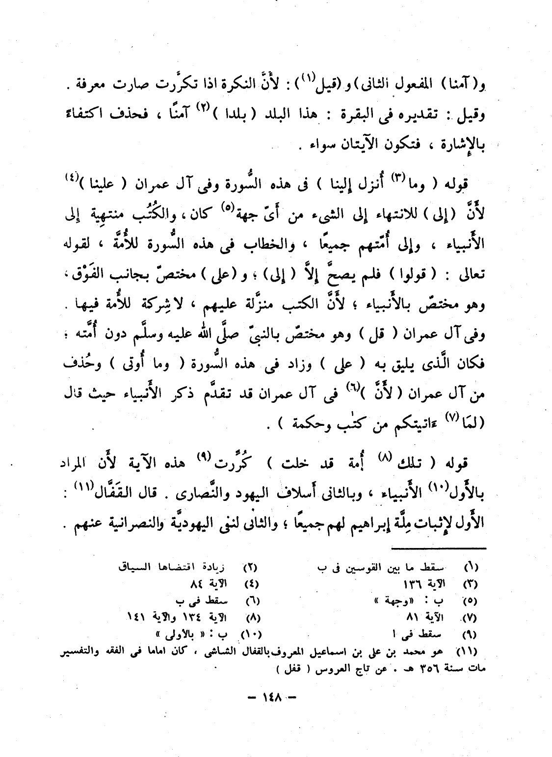 قوله {وَمَآ أُنْزِلَ إِلَيْنَا} فى هذه السُّورة وفى آل عمران (علينا) لأَنَّ (إِلى) للانتهاء إِلى الشىء من أَىّ جهة كان، والكُتُب منتهِية إِلى الأَنبياء، وإِلى أُمّتهم جميعاً، والخطاب فى هذه السُّورة للأُمَّة، لقوله تعالى: (قولوا) فلم يصحَّ إِلاَّ (إِلى) ؛ و (على) مختصّ بجانب الفَوْق، وهو مختصّ بالأَنبياء؛ لأَنَّ الكتب منزَّلة عليهم، لا شِركة للأُمة فيها. وفى آل عمران (قل) وهو مختصّ بالنبىّ صلَّى الله عليه وسلَّم دون أَمَّته؛ فكان الَّذى يليق به (على) وزاد فى هذه السُّورة (وما أُوتى) وحُذف من آل عمران (لأَنَّ) فى آل عمران قد تقدَّم ذكر الأَنبياء حيث قال {لَمَآ آتَيْتُكُم مِّن كِتَابٍ وَحِكْمَةٍ} .