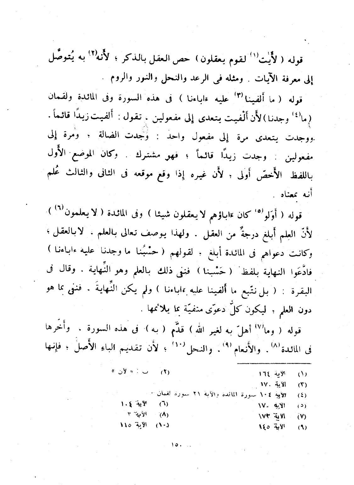 قوله {أَوَلَوْ كَانَ آبَاؤُهُمْ لاَ يَعْقِلُونَ شَيْئاً} وفى المائدة {لاَ يَعْلَمُوْنَ} لأَنَّ العِلم أَبلغ درجةً من العقل، ولهذا يوصف تعالى بالعلم، لا بالعقل؛ وكانت دعواهم فى المائدة أبلغ؛ لقولهم {حَسْبُنَا مَا وَجَدْنَا عَلَيْهِءَابَآءَنَا} فادَّعَوا النهاية بلفظ (حَسْبنا) فنفى ذلك بالعلم وهو النِّهاية، وقال فى البقرة: {بَلْ نَتَّبِعُ مَآ أَلْفَيْنَا عَلَيْهِ آبَآءَنَآ} ولم يكن النِّهايةَ، فنفى بما هو دون العلم؛ ليكون كلُّ دعوَى منفيّة بما يلائمها.