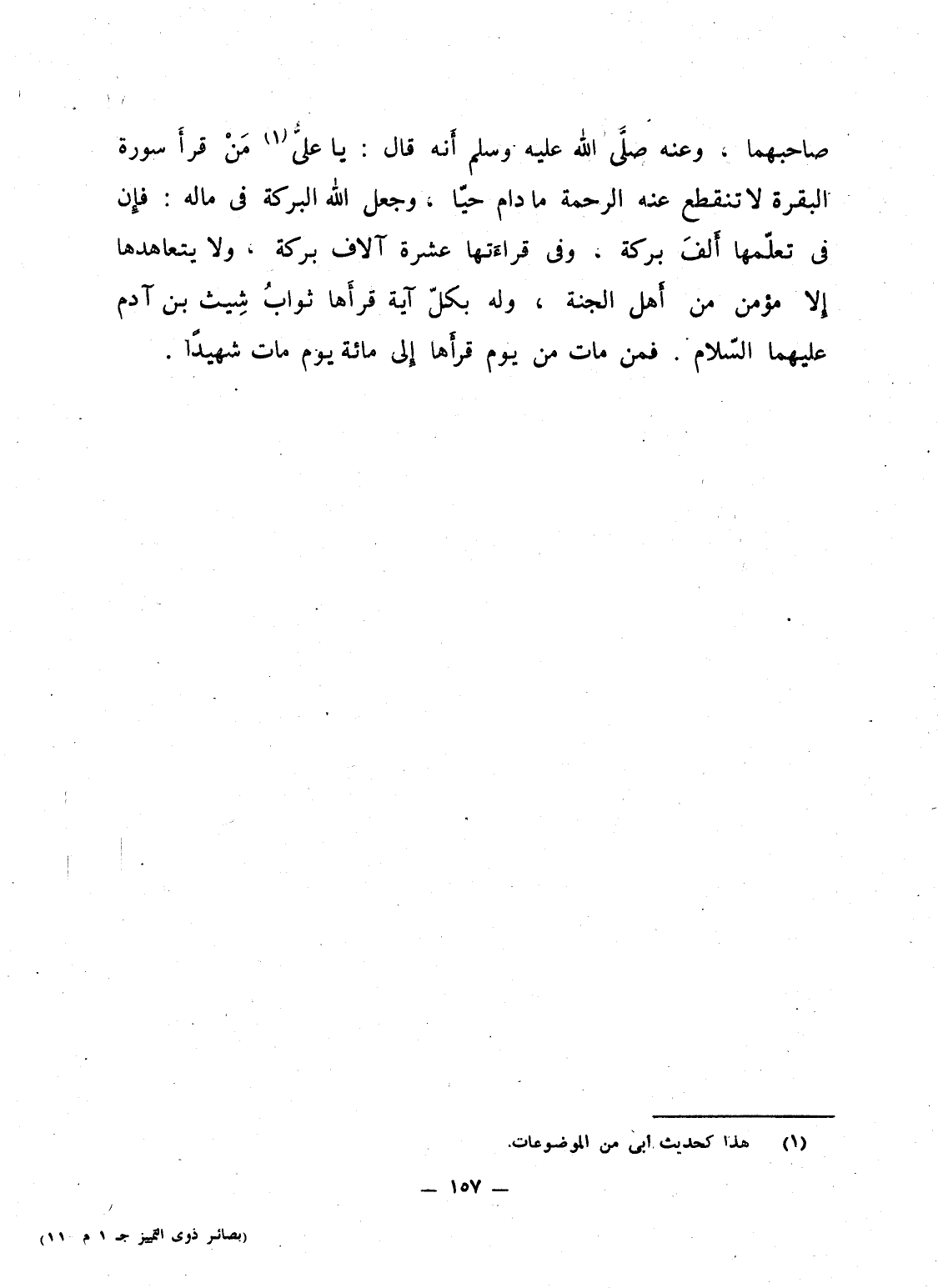 صاحبهما" وعنه صلَّى الله عليه وسلم أَنه قال: "يا علىُّ مَنْ قرأَ سورة البقرة لا تنقطع عنه الرحمة ما دام حيّا، وجعل الله البركة فى ماله: فإِن فى تعلّمها أَلفَ بركة، وفى قراءَتها عشرة آلاف بركة، ولا يتعاهدها إِلا مؤمن من أَهل الجنة، وله بكلّ آية قرأَها ثوابُ شِيث بن آدم عليهما السّلام. فمن مات من يوم قرأَها إِلى مائة يوم مات شهيداً".