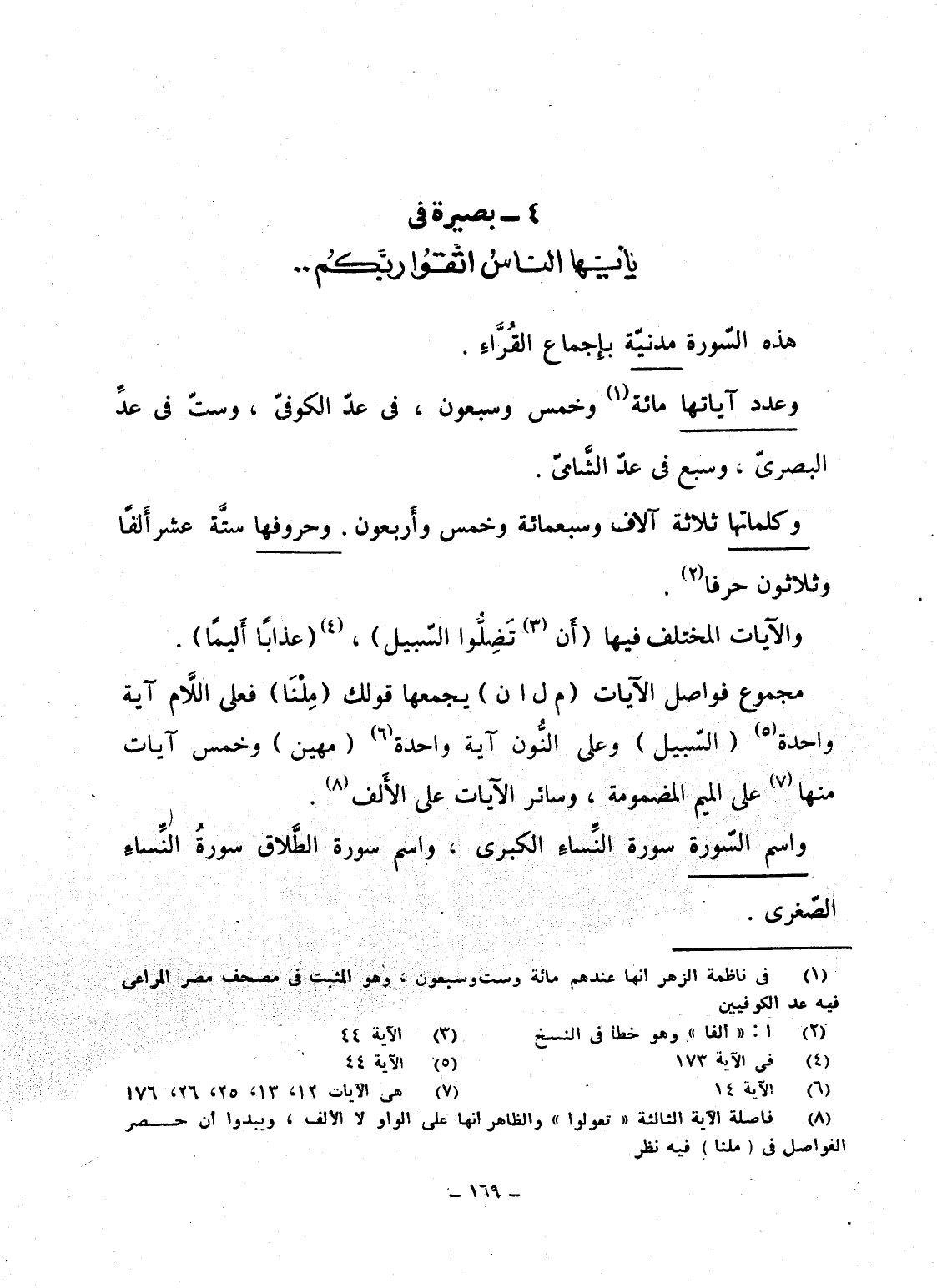 وعدد آياتها مائة وخمس وسبعون، فى عدّ الكوفىّ، وستّ فى عدِّ البصرىّ، وسبع فى عدّ الشَّامىّ.