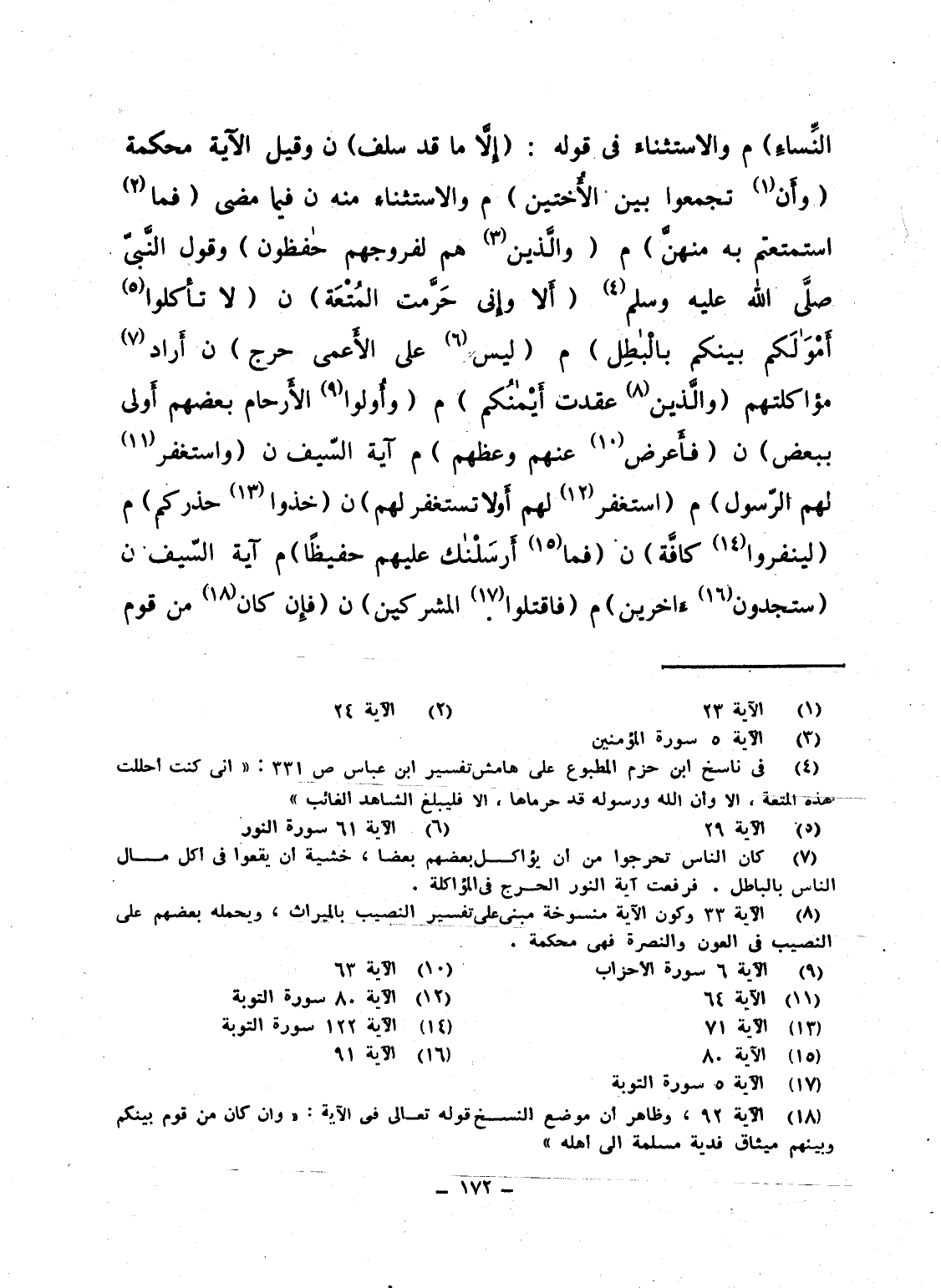 النسآء} م والاستثناء فى قوله: {إِلاَّ مَا قَدْ سَلَفَ} ن وقيل الآية محكمة {وَأَن تَجْمَعُواْ بَيْنَ الأختين} م والاستثناء منه ن فيما مضى {فَمَا استمتعتم بِهِ مِنْهُنَّ} م {والذين هُمْ لِفُرُوجِهِمْ حَافِظُونَ} وقول النَّبىّ صلَّى الله عليه وسلم: "أَلا وإِنى حَرَّمت المُتْعَة" ن {لاَ تأكلوا أَمْوَالَكُمْ بَيْنَكُمْ بالباطل} م {لَّيْسَ عَلَى الأعمى حَرَجٌ} ن أَراد مؤاكلتهم {والذين عَقَدَتْ أَيْمَانُكُمْ} م {وَأُوْلُو الأرحام بَعْضُهُمْ أولى بِبَعْضٍ} ن {فَأَعْرِضْ عَنْهُمْ وَعِظْهُمْ} م آية السّيف ن {وَاسْتَغْفَرَ لَهُمُ الرَّسُوْلُ} م {اسْتَغْفِرْ لَهُمْ أَوْ لاَ تَسْتَغْفِر لَهُمْ} ن {خُذُوْا حِذْرَكُمْ} م {لِيَنْفِرُوْا كآفَّة} ن {فَمَآ أَرْسَلْنَاكَ عَلَيْهِمْ حَفِيظاً} م آية السّيف ن {سَتَجِدُونَ آخَرِينَ} م {فَاقْتُلُوْا الْمُشْرِكِينَ} ن {فَإِن كَانَ مِن قَوْمٍ