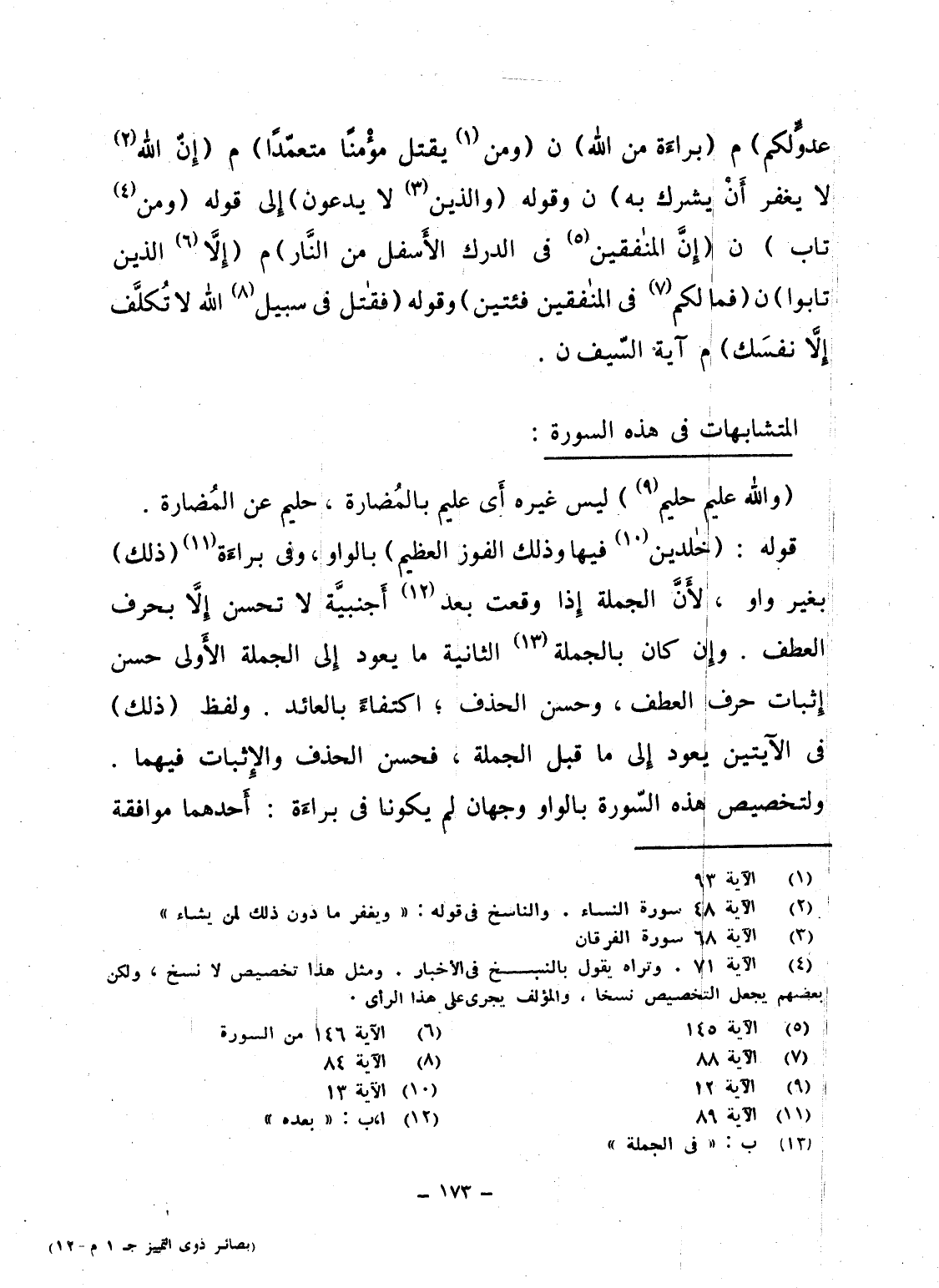 عَدُوٍّ لَّكُمْ} م {بَرَآءَةٌ مِّنَ الله} ن {وَمَن يَقْتُلْ مُؤْمِناً مُّتَعَمِّداً} م {إِنَّ الله لاَ يَغْفِرُ أَن يُشْرَكَ بِهِ} ن وقوله {والذين لاَ يَدْعُونَ} إِلى قوله {وَمَنْ تَابَ} ن {إِنَّ المنافقين فِي الدرك الأسفل مِنَ النار} م {إِلاَّ الذين تَابُواْ} ن {فَمَا لَكُمْ فِي المنافقين فِئَتَيْنِ} وقوله {فَقَاتِلْ فِي سَبِيلِ الله لاَ تُكَلَّفُ إِلاَّ نَفْسَكَ} م آية السّيف ن.