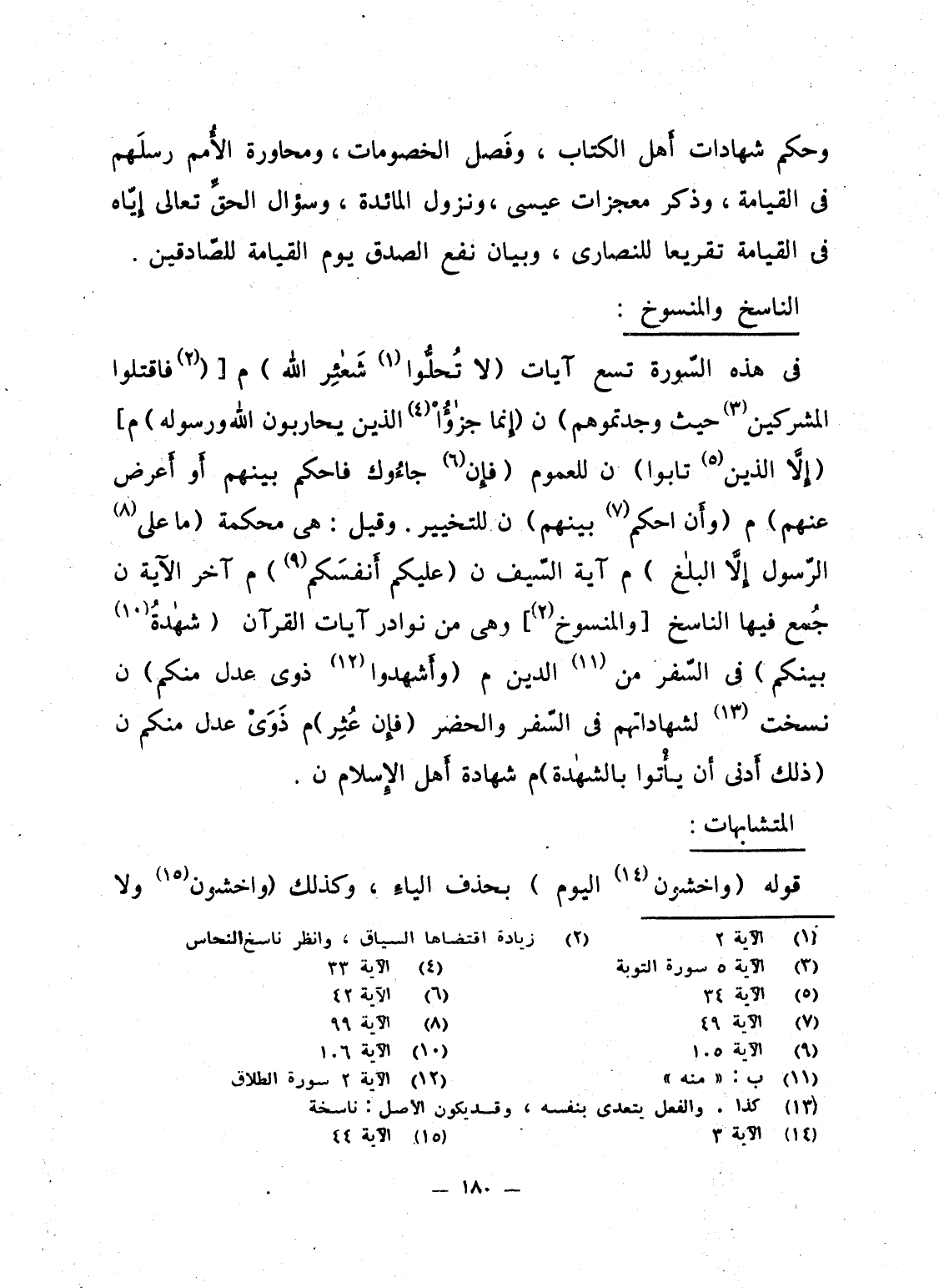 فى هذه السّورة تسع آيات {لاَ تُحِلُّواْ شَعَآئِرَ الله} م [ {فاقتلوا المشركين حَيْثُ وَجَدتُّمُوهُمْ} ن {إِنَّمَا جَزَآءُ الذين يُحَارِبُونَ الله وَرَسُولَهُ} م] {إِلاَّ الذين تَابُواْ} ن للعموم {فَإِن جَآءُوكَ فاحكم بَيْنَهُمْ أَوْ أَعْرِضْ عَنْهُمْ} م {وَأَنِ احكم بَيْنَهُم} ن للتخيير: وقيل: هى محكمة {مَّا عَلَى الرسول إِلاَّ البلاغ} م آية السّيف ن {عَلَيْكُمْ أَنْفُسَكُمْ} م آخر الآية ن جُمع فيها الناسخ [والمنسوخ] وهى من نوادر آيات القرآن {شَهَادَةُ بَيْنِكُمْ} فى السّفر من الدين م {وَأَشْهِدُواْ ذَوَي عَدْلٍ مِّنكُمْ} ن نسخت لشهاداتهم فى السّفر والحضر {فَإِنْ عُثِرَ} م ذَوَىْ عدل منكم ن {ذلك أدنى أَن يَأْتُواْ بالشهادة} م شهادة أَهل الإِسلام ن.