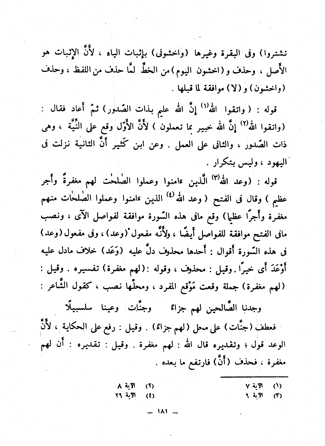 قوله: {وَعَدَ الله الذين آمَنُواْ وَعَمِلُواْ الصالحات لَهُم مَّغْفِرَةٌ وَأَجْرٌ عَظِيمٌ} وقال فى الفتح {وَعَدَ الله الذين آمَنُواْ وَعَمِلُواْ الصالحات مِنْهُم مَّغْفِرَةً وَأَجْراً عَظِيماً} وقع ما فى هذه السّورة موافقة لفواصل الآى، ونصب ما فى الفتح موافقة للفواصل أَيضاً، ولأَنَّه مفعول (وعد) ، وفى مفعول (وعد) فى هذه السّورة أَقوال: أَحدها محذوف دلَّ عليه (وَعَد) ، خلاف ما دل عليه أَوْعَدَ أَى خيراً. وقيل: محذوف، وقوله: {لَهُم مَّغْفِرَةٌ} تفسيره. وقيل: {لَهُم مَّغْفِرَةٌ} جملة وقعت مَوْقع المفرد، ومحلَّها نصب، كقول الشَّاعر: