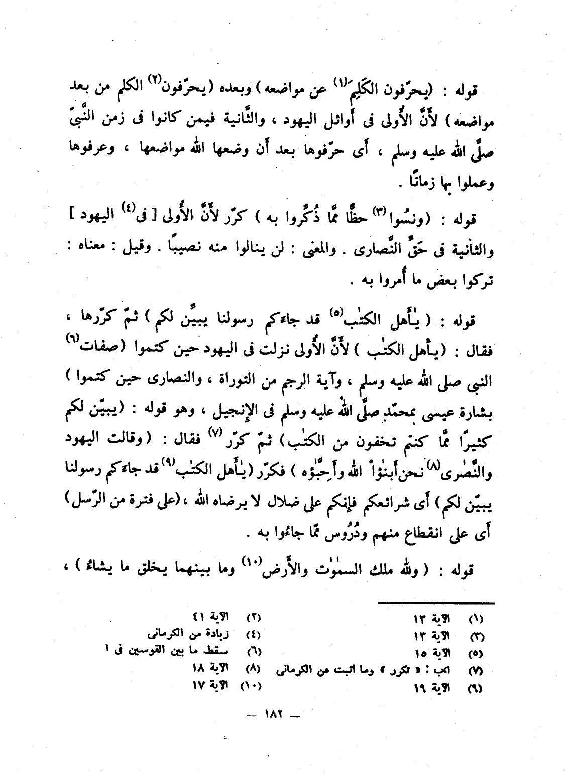 قوله: {يُحَرِّفُونَ الكلم عَن مَّوَاضِعِهِ} وبعده {يُحَرِّفُونَ الكلم مِنْ بَعْدِ مَّوَاضِعِهِ} لأَنَّ الأُولى فى أَوائل اليهود، والثَّانية فيمن كانوا فى زمن النَّبىّ صلَّى الله عليه وسلم، أَى حرّفوها بعد أَن وضعها الله مواضعها، وعرفوها وعملوا بها زماناً.