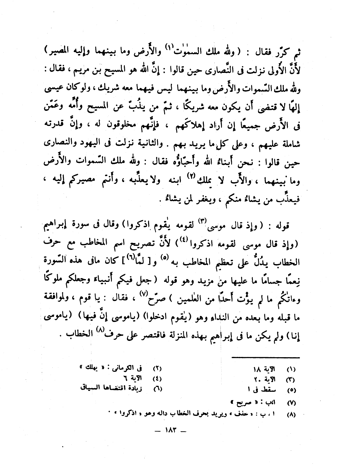ثم كرّر فقال: {وَللَّهِ مُلْكُ السماوات والأرض وَمَا بَيْنَهُمَا وَإِلَيْهِ المصير} لأَنَّ الأُولى نزلت فى النَّصارى حين قالوا: إِنَّ الله هو المسيح بن مريم، فقال: ولله ملك السّماوات والأَرض وما بينهما ليس فيهما معه شريك، ولو كان عيسى إلهاً لاقتضى أَن يكون معه شريكاً، ثمّ من يذُبّ عن المسيح وأُمِّه وعَمّن فى الأَرض جميعاً إِن أَراد إِهلاكَهم، فإِنَّهم مخلوقون له، وإِنَّ قدرته شاملة عليهم، وعلى كل ما يريد بهم. والثانية نزلت فى اليهود والنصارى حين قالوا: نحن أَبناءُ الله وأَحبّاؤُه فقال: ولله ملك السّماوات والأَرض وما بينهما، والأَب لا يملك ابنه ولا يعذِّبه، وأَنتم مصيركم إِليه، فيعذِّب من يشاءُ منكم، ويغفر لمن يشاءُ.