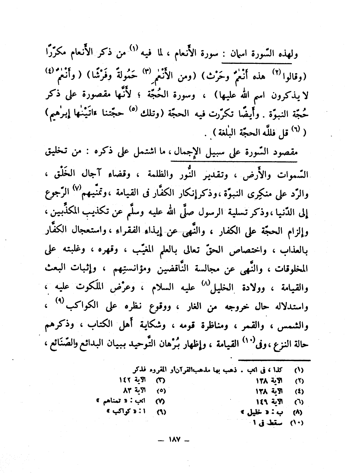 مقصود السّورة على سبيل الإِجمال، ما اشتمل على ذكره: من تخليق السّماوات والأَرض، وتقدير النُّور والظلمة، وقضاءِ آجال الخَلْق، والرّد على منكِرى النبوّة، وذكر إِنكار الكفَّار فى القيامة، وتمنّيهم الرّجوع إِلى الدّنيا، وذكر تسلية الرسول صلَّى الله عليه وسلَّم عن تكذيب المكذِّبين، وإِلزام الحجّة على الكفار، والنَّهى عن إِيذاءِ الفقراءِ، واستعجال الكفَّار بالعذاب، واختصاص الحقّ تعالى بالعلم المغيّب، وقهره، وغلبته على المخلوقات، والنَّهى عن مجالسة النَّاقضين ومؤانستِهم، وإِثبات البعث والقيامة، وولادة الخليل عليه السلام، وعرْض الملَكوت عليه، واستدلاله، حال خروجه من الغار، ووقوع نظره على الكواكب، والشمس، والقمر، ومناظرة قومه، وشكاية أَهل الكتاب، وذكرهم حالة النزع، وفى القيامة، وإِظهار بُرْهان التَّوحيد ببيان البدائع والصّنَائع،