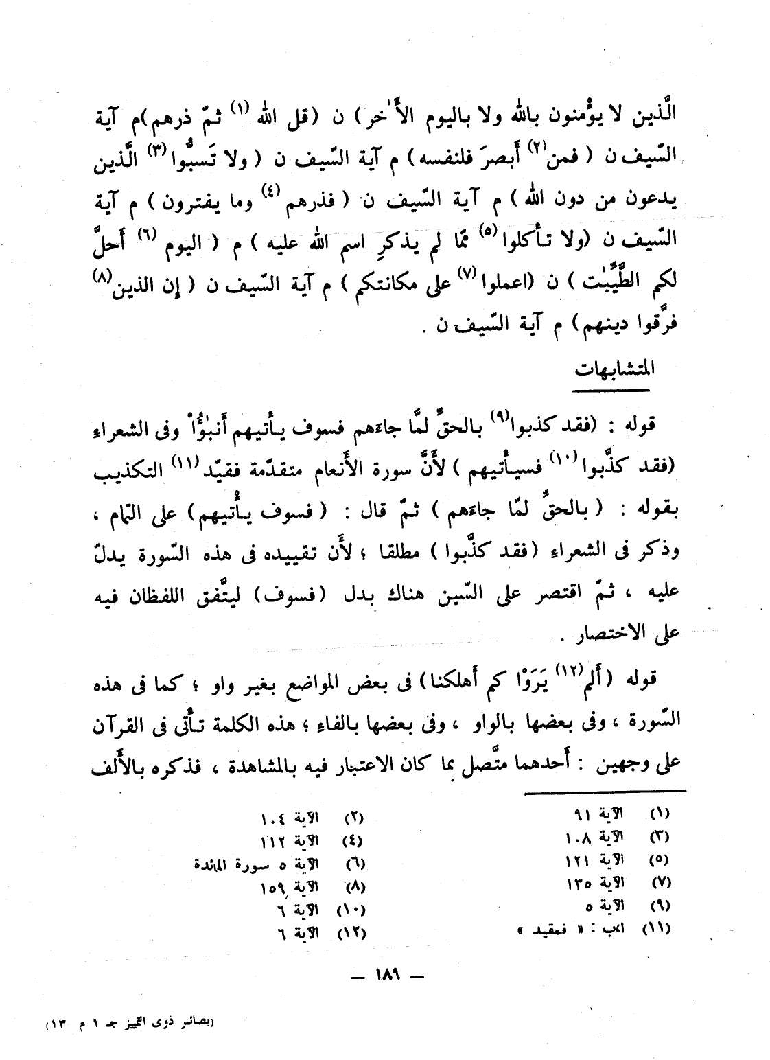 الذين لاَ يُؤْمِنُونَ بالله وَلاَ باليوم الآخر} ن {قُلِ الله ثُمَّ ذَرْهُمْ} م آية السّيف ن {فَمَنْ أَبْصَرَ فَلِنَفْسِهِ} م آية السّيف ن {وَلاَ تَسُبُّواْ الذين يَدْعُونَ مِن دُونِ الله} م آية السّيف ن {فَذَرْهُمْ وَمَا يَفْتَرُونَ} م آية السّيف ن {وَلاَ تَأْكُلُواْ مِمَّا لَمْ يُذْكَرِ اسم الله عَليه} م {اليوم أُحِلَّ لَكُمُ الطيبات} ن {اعملوا على مَكَانَتِكُمْ} م آية السّيف ن {إِنَّ الذين فَرَّقُواْ دِينَهُمْ} م آية السّيف ن.
