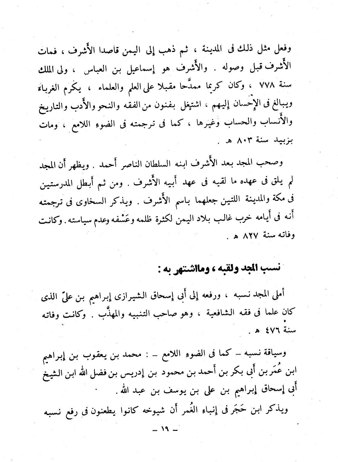 وفعل مثل ذلك فى المدينة، ثم ذهب إِلى اليمن قاصدا الأَشرف، فمات الأَشرف قبل وصوله. والأَشرف هو إِسماعيل بن العباس، ولى الملك سنة 778، وكان كريما ممدَّحا مقبلا على العلم والعلماء، يكرم الغرباءَ ويبالغ فى الإِحسان إِليهم، اشتغل بفنون من الفقه والنحو والأَدب والتاريخ والأَنساب والحساب وغيرها، كما فى ترجمته فى الضوءِ اللامع، ومات بزبيد سنة 803هـ.