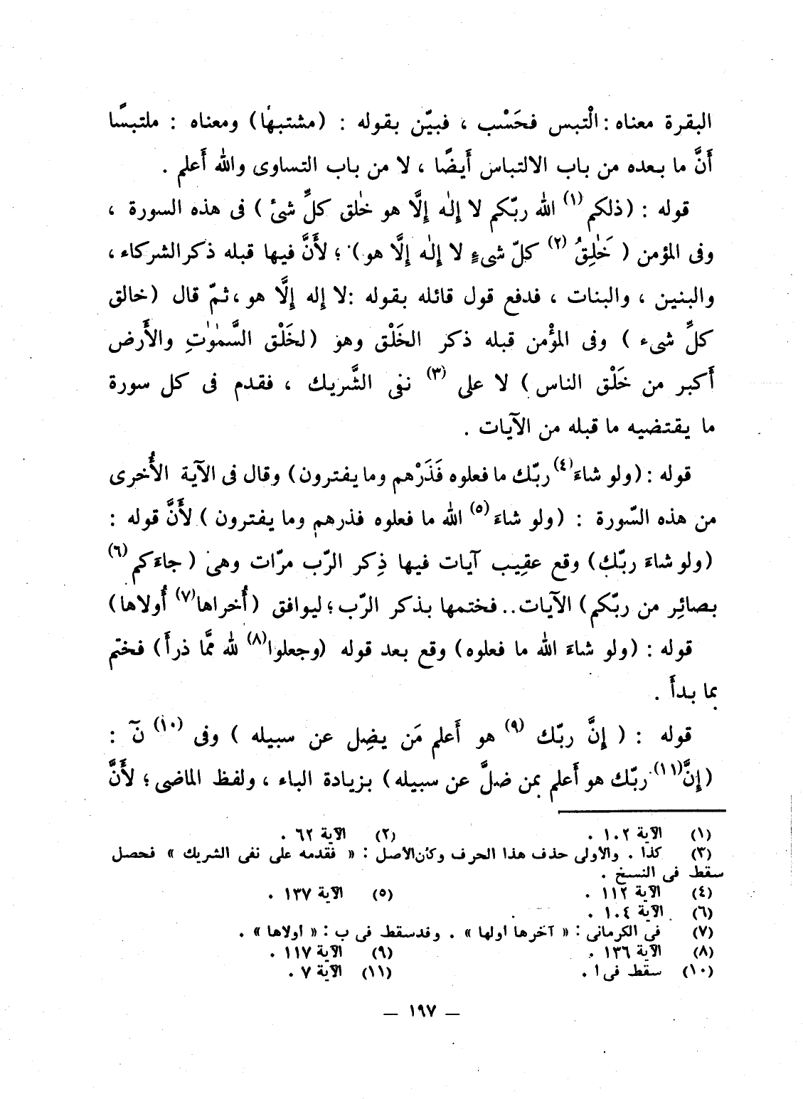 قوله: {وَلَوْ شَآءَ رَبُّكَ مَا فَعَلُوهُ فَذَرْهُمْ وَمَا يَفْتَرُونَ} وقال فى الآية الأُخرى من هذه السّورة: {وَلَوْ شَآءَ الله مَا فَعَلُوهُ فَذَرْهُمْ وَمَا يَفْتَرُونَ} لأَنَّ قوله: {وَلَوْ شَآءَ رَبُّكَ} وقع عقِيب آيات فيها ذِكر الرّب مرّات وهى {جَآءَكُمْ بَصَآئِرُ مِن رَّبِّكُمْ} الآيات ... فختمها بذكر الرّب؛ ليوافق {أُخْرَاهَا أُوْلاَهَا} .
