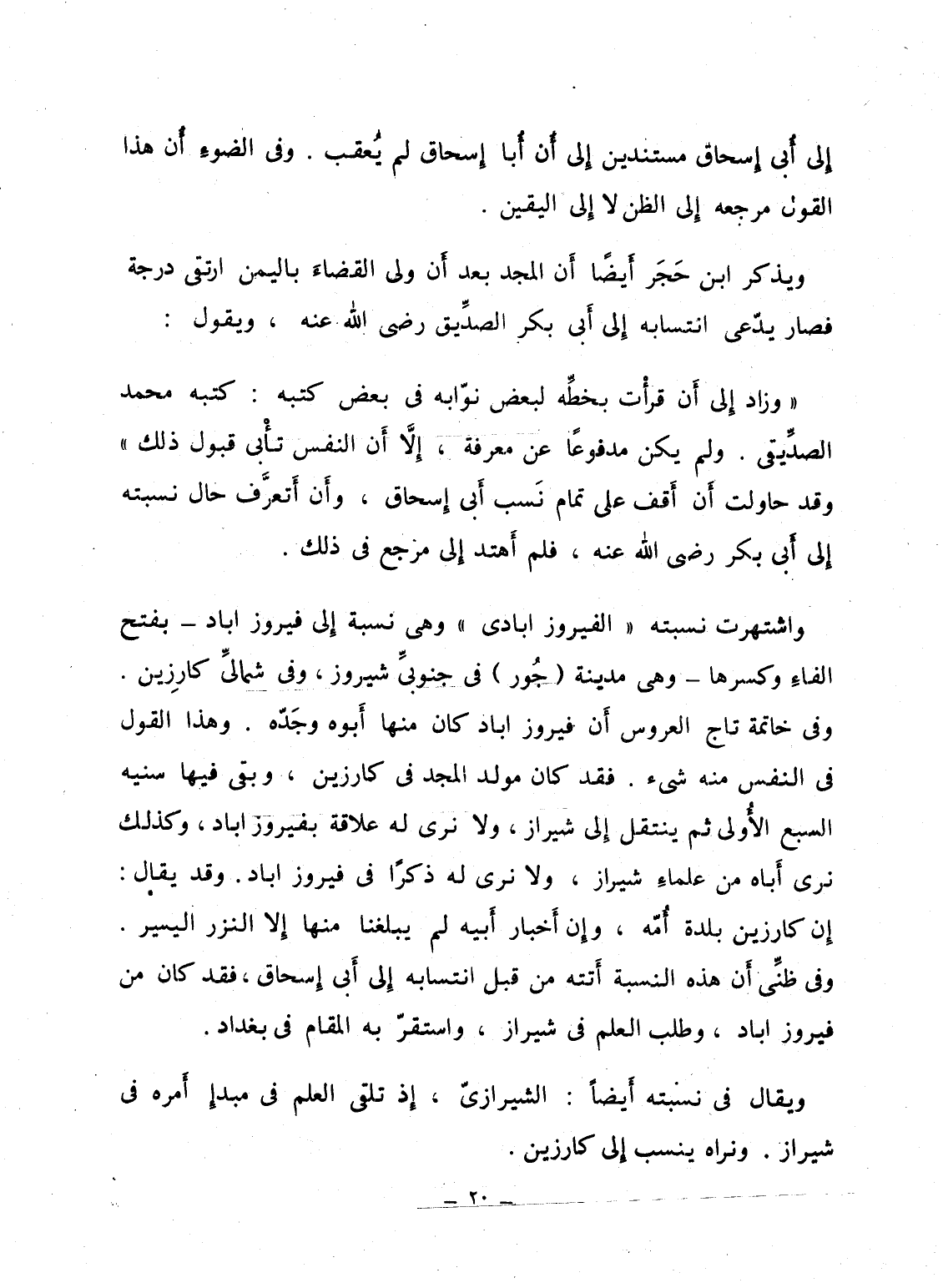 واشتهرت نسبته "الفيروز ابادى" وهى نسبه إِلى فيروز اباد - بفتح الفاءِ وكسرها - وهى مدينة (جُور) فى جنوبىِّ شيروز، وفى شمالىِّ كارِزين. وفى خاتمة تاج العروس أَن فيروز اباد كان منها أَبوه وجَدّه. وهذا القول فى النفس منه شىء. فقد كان مولد المجد فى كارزين، وبقى فيها سنيه السبع الأُولى ثم ينتقل إِلى شيراز، ولا نرى له علاقة بفيروز اباد، وكذلك نرى أَباه من علماءِ شيراز، ولا نرى له ذكراً فى فيروز اباد. وقد يقال: إِن كارزين بلدة أُمّه، وإِن أَخبار أَبيه لم يبلغنا منها إِلا النزر اليسير. وفى ظنِّى أَن هذه النسبة أَتته من قبل انتسابه إِلى أَبى إِسحاق، فقد كان من فيروز اباد، وطلب العلم فى شيراز، واستقرّ به المقام فى بغداد.