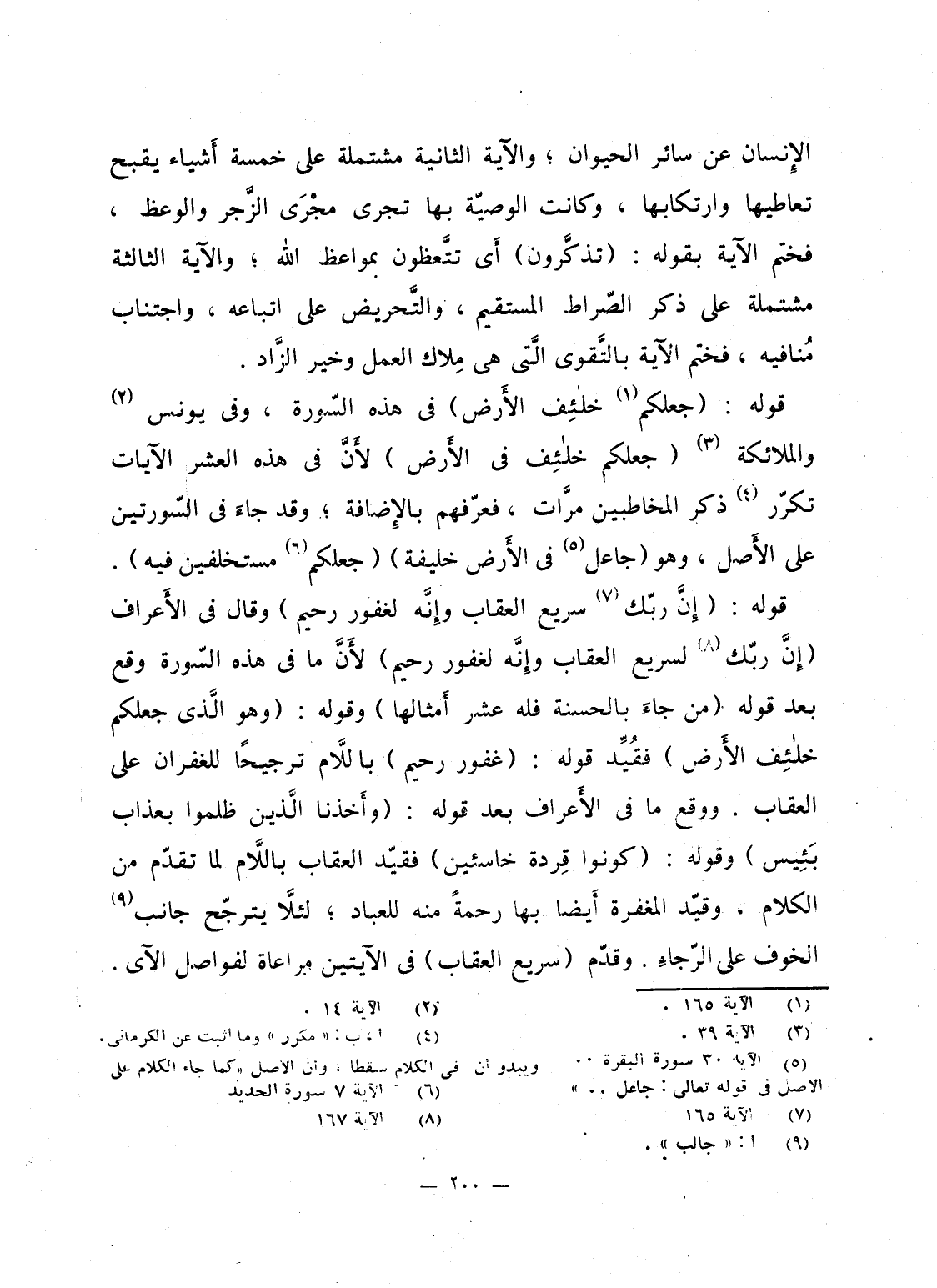 قوله: {جَعَلَكُمْ خَلاَئِفَ الأرض} فى هذه السّورة، وفى يونس والملائكة {جَعَلْنَاكُمْ خَلاَئِفَ فِي الأرض} لأَنَّ فى هذه العشر الآيات تكرّر ذكر المخاطبين مرَّات، فعرّفهم بالإِضافة؛ وقد جاءَ فى السّورتين على الأَصل، وهو {جَاعِلٌ فِي الأرض خَلِيفَةً} {جَعَلَكُمْ مُسْتَخْلَفِيْنَ فِيْهِ} . قوله: {إِنَّ رَبَّكَ سَرِيعُ العقاب وَإِنَّهُ لَغَفُورٌ رَّحِيمٌ} وقال فى الأَعراف {إِنَّ رَبَّكَ لَسَرِيعُ العقاب وَإِنَّهُ لَغَفُورٌ رَّحِيمٌ} لأَنَّ ما فى هذه السّورة وقع بعد قوله {مَنْ جَاءَ بِالْحَسَنَةِ فَلَهُ عَشْرُ أَمْثَالِهَا} وقوله: {وَهُوَ الَّذِيْ جَعَلَكُمْ خَلاَئِفَ الأرض} فقُيِّد قوله: {غَفُورٌ رَّحِيمٌ} بالَّلام ترجيحاً للغفران على العقاب. ووقع ما فى الأَعراف بعد قوله: {وَأَخَذْنَا الذين ظَلَمُواْ بِعَذَابٍ بَئِيسٍ} وقوله: {كُونُواْ قِرَدَةً خَاسِئِينَ} فقيّد العقاب بالَّلام لما تقدّم من الكلام، وقيّد المغفرة أَيضا بها رحمةً منه للعباد؛ لئلاَّ يترجّح جانب الخوف على الرّجاءِ. وقدّم {سَرِيْعُ الْعِقَابِ} فى الآيتين مراعاة لفواصل الآى.