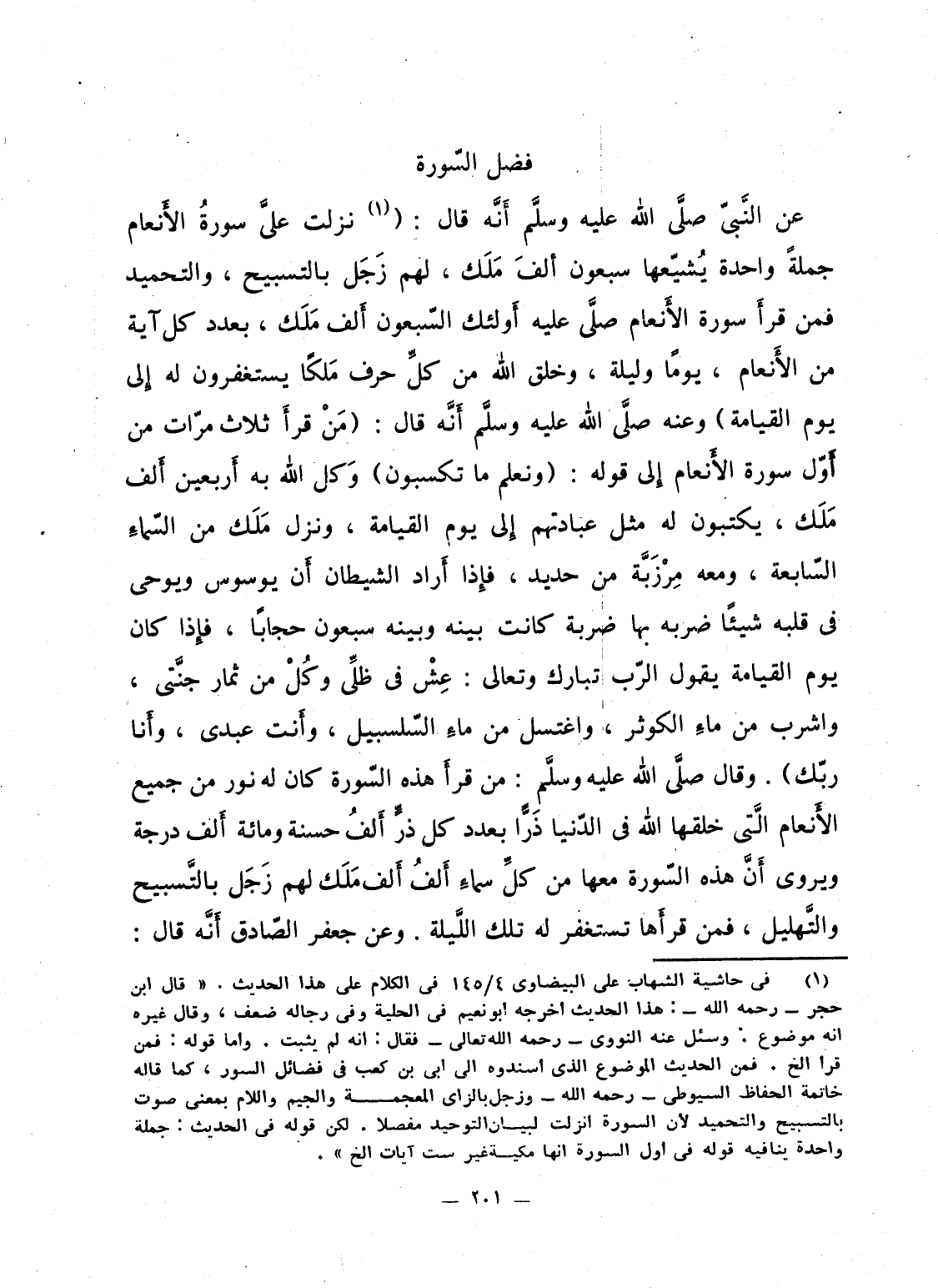 عن النَّبىّ صلَّى الله عليه وسلَّم أَنَّه قال: "نزلت علىَّ سورةُ الأَنعام جملةً واحدة يُشيّعها سبعون أَلفَ مَلَك، لهم زَجَل بالتسبيح، والتحميد فمن قرأَ سورة الأَنعام صلَّى عليه أَولئك السّبعون أَلف مَلَك، بعدد كل آية من الأَنعام، يوماً وليلة، وخلق الله من كلِّ حرف مَلكاً يستغفرون له إِلى يوم القيامة" وعنه صلَّى الله عليه وسلَّم أَنَّه قال: "مَنْ قرأَ ثلاث مرّات من أَوّل سورة الأَنعام إِلى قوله: {وَنَعْلَمُ مَا تَكْسِبُوْنَ} وَكل الله به أَربعين أَلف مَلَك، يكتبون له مثل عبادتهم إِلى يوم القيامة، ونزل مَلَك من السّماءِ السّابعة، ومعه مِرْزَبَّة من حديد، فإِذا أَراد الشيطان أَن يوسوس ويوحى فى قلبه شيئاً ضربه بها ضربة كانت بينه وبينه سبعون حجاباً، فإّذا كان يوم القيامة يقول الرّب تبارك وتعالى: عِشْ فى ظلِّى وكُلْ من ثمار جنَّتى، واشرب من ماءِ الكوثر، واغتسل من ماءِ السّلسبيل، وأَنت عبدى، وأَنا ربّك". وقال صلَّى الله عليه وسلَّم: "من قرأَ هذه السّورة كان له نور من جميع الأَنعام الَّتى خلقها الله فى الدّنيا ذَرّاً بعدد كل ذرٍّ أَلفُ حسنة ومائة أَلف درجة" ويروى أَنَّ هذه السّورة معها من كلِّ سماءِ أَلفُ أَلف مَلَك لهم زَجَل بالتَّسبيح والتَّهليل، فمن قرأَها تستغفر له تلك اللَّيلة. وعن جعفر الصّادق أَنَّه قال: