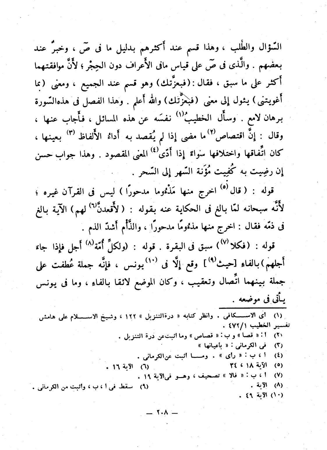 السّؤال والطلب، وهذا قسم عند أَكثرهم بدليل ما فى ص، وخبرٌ عند بعضهم. والَّذى فى ص على قياس ما فى الأَعراف دون الحِجْر؛ لأَنَّ موافقتهما أكثر على ما سبق، فقال: {فَبِعِزَّتِكَ} وهو قسم عند الجميع، ومعنى {بِمَا أَغْوَيْتَنِي} يئول إِلى معنى {فَبِعِزَّتِكَ} والله أَعلم. وهذا الفصل فى هذه السّورة برهان لامع. وسأَل الخطيبُ نفسَه عن هذه المسائل، فأَجاب عنها، وقال: إِنَّ اقتصاص ما مضى إِذا لم يُقصد به أَداءُ الأَلفاظ بعينها، كان اتِّفاقها واختلافها سواءً إِذا أَدّى المعنى المقصود، وهذا جواب حسن إِن رضِيت به كُفِيت مُؤَنة السّهر إِلى السّحر.