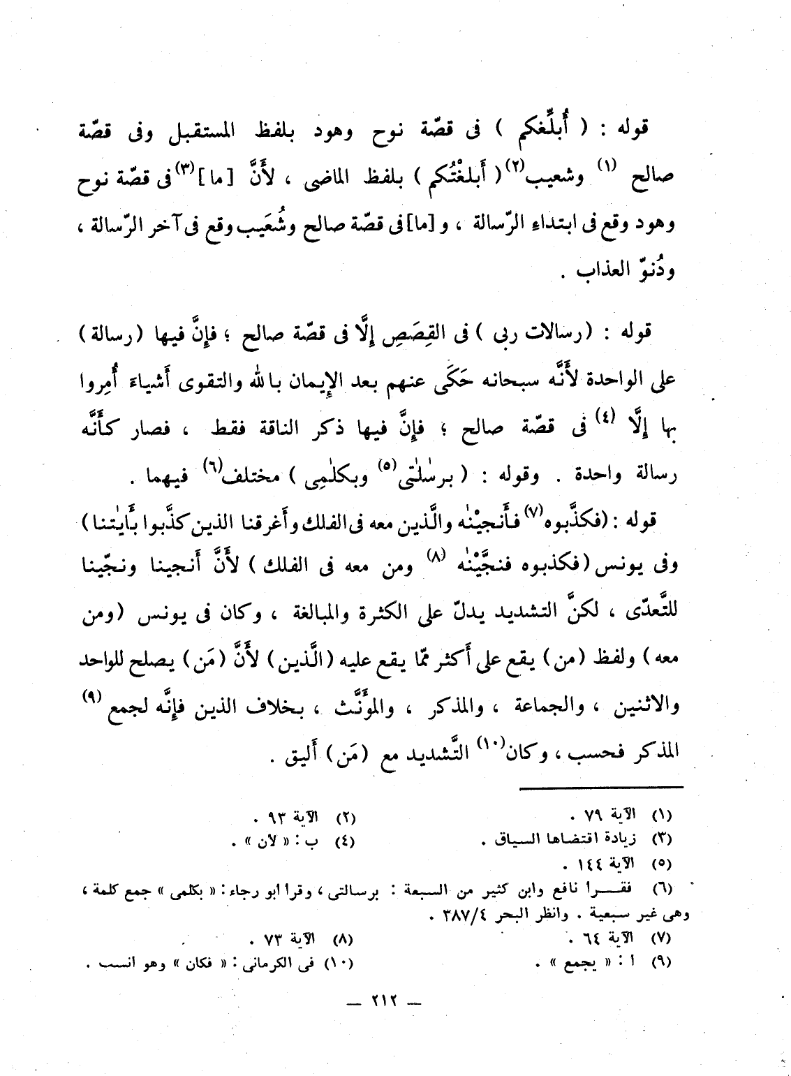 قوله: {رِسَالاَتُ رَبِّي} فى القِصَصِ إِلاَّ فى قصّة صالح؛ فإِنَّ فيها (رسالة) على الواحدة لأَنَّه سبحانه حَكَى عنهم بعد الإِيمان بالله والتقوى أَشياءَ أُمِروا بها إِلاَّ فى قصّة صالح؛ فإِنَّ فيها ذكر الناقة فقط، فصار كأَنَّه رسالة واحدة. وقوله: {بِرِسَالاَتِي وبِكَلاَمِي} مختلف فيهما.