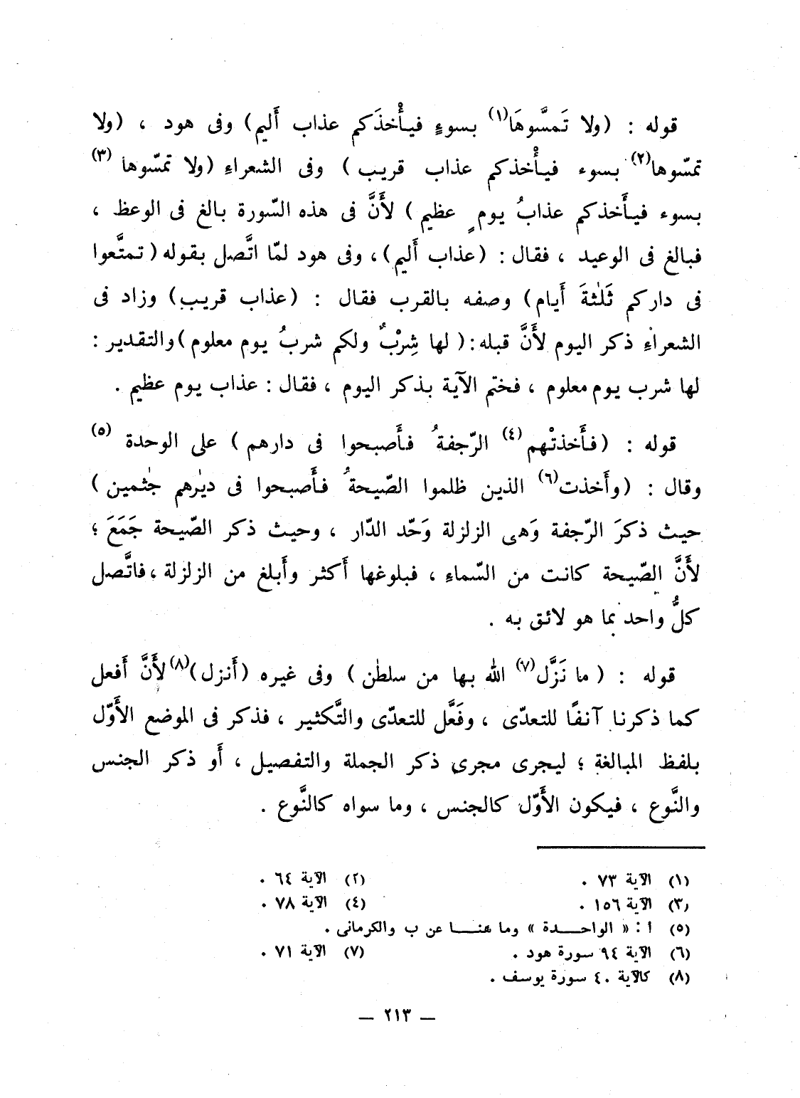 قوله: {وَلاَ تَمَسُّوهَا بسواء فَيَأْخُذَكُمْ عَذَابٌ أَلِيمٌ} وفى هود، {وَلاَ تَمَسُّوهَا بسواء فَيَأْخُذَكُمْ عَذَابٌ قَرِيبٌ} وفى الشعراءِ {وَلاَ تَمَسُّوهَا بسواء فَيَأْخُذَكُمْ عَذَابُ يَوْمٍ عَظِيمٍ} لأَنَّ فى هذه السّورة بالغ فى الوعظ، فبالغ فى الوعيد، فقال: {عَذَابٌ أَلِيمٌ} ، وفى هود لمّا اتَّصل بقوله {تَمَتَّعُوْا فِي دَارِكُمْ ثَلاثَةَ أَيَّامٍ} وصفه بالقرب فقال: {عَذَابٌ قَرِيبٌ} وزاد فية الشعراءِ ذكر اليوم لأَنَّ قبله: {لَهَا شِرْبٌ وَلَكُمْ شِرْبُ يَوْمٍ مَعْلُومٍ} والتقدير: لها شرب يوم معلوم، فختم الآية بذكر اليوم، فقال: عذاب يوم عظيم.