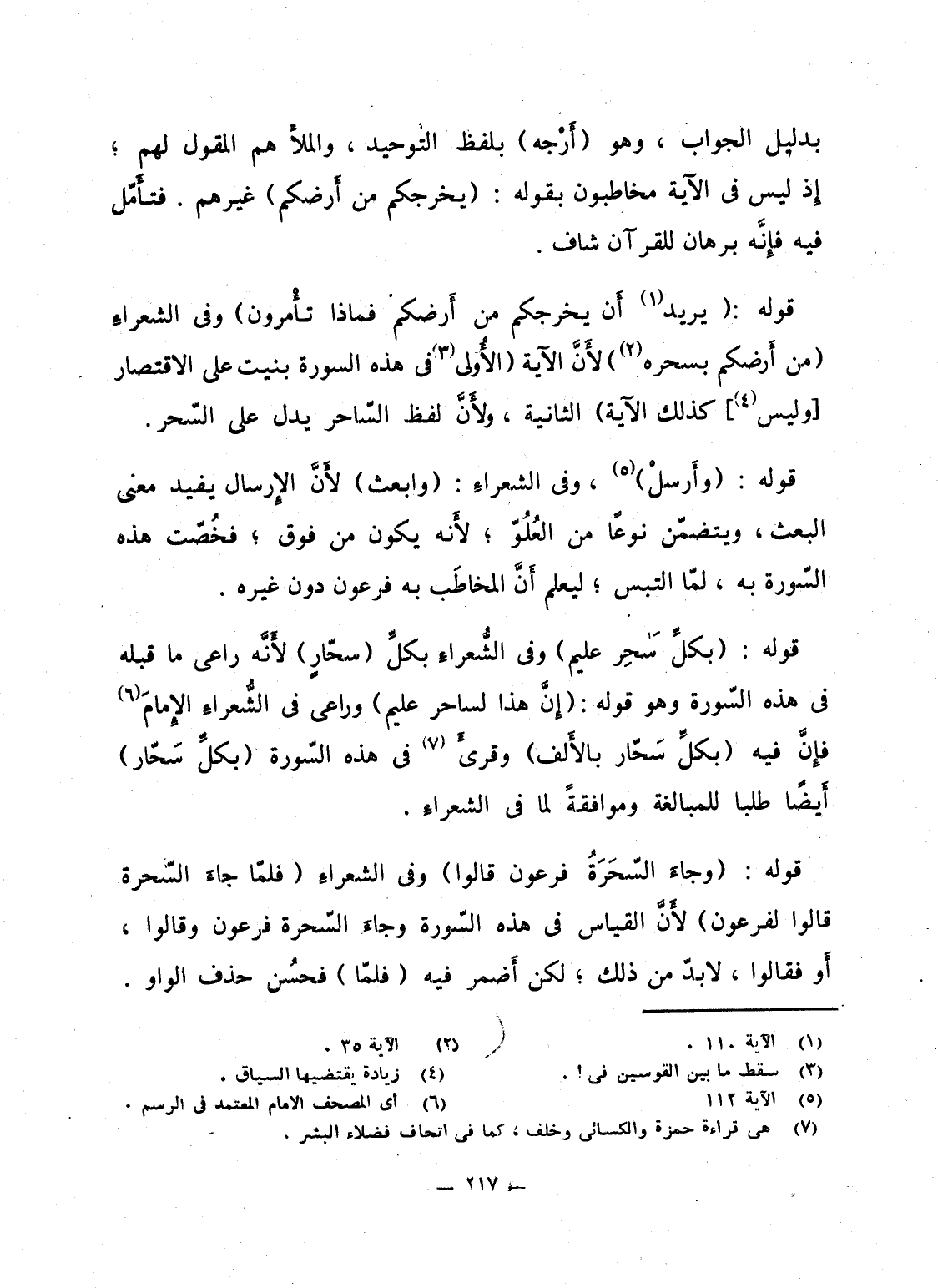 قوله: {يُرِيدُ أَن يُخْرِجَكُمْ مِّنْ أَرْضِكُمْ فَمَاذَا تَأْمُرُونَ} وفى الشعراءِ {مِّنْ أَرْضِكُمْ بِسِحْرِهِ} لأَنَّ الآية (الأُولى فى هذه السورة بنيت على الاقتصار [وليس] كذلك الآية) الثانية، ولأَنَّ لفظ السّاحر يدل على السّحر.