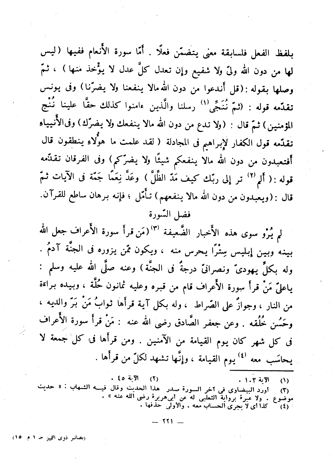 ثم يُرْو سوى هذه الأَخبار الضَّعيفة (مَن قرأَ سورة الأَعراف جعل الله بينه وبين إِبليس سِتْراً يحرس منه، ويكون ممّن يزوره فى الجنَّة آدمُ. وله بكلِّ يهودىّ ونصرانىّ درجةٌ فى الجنَّة) وعنه صلَّى الله عليه وسلم: يا علىّ مَنْ قرأَ سورة الأَعراف قام من قبره وعليه ثمانون حُلَّة، وبيده براءَة من النار، وجوازٌ على الصّراط، وله بكل آية قرأَها ثوابُ مَنْ بَرّ والديه، وحَسُن خُلُقه. وعن جعفر الصَّادق رضى الله عنه: مَنْ قرأَ سورة الأَعراف فى كل شهر كان يوم القيامة من الآمنين. ومن قرأَها فى كل جمعة لا يحاسَب معه يوم القيامة، وإِنَّها تشهد لكلّ من قرأَها.