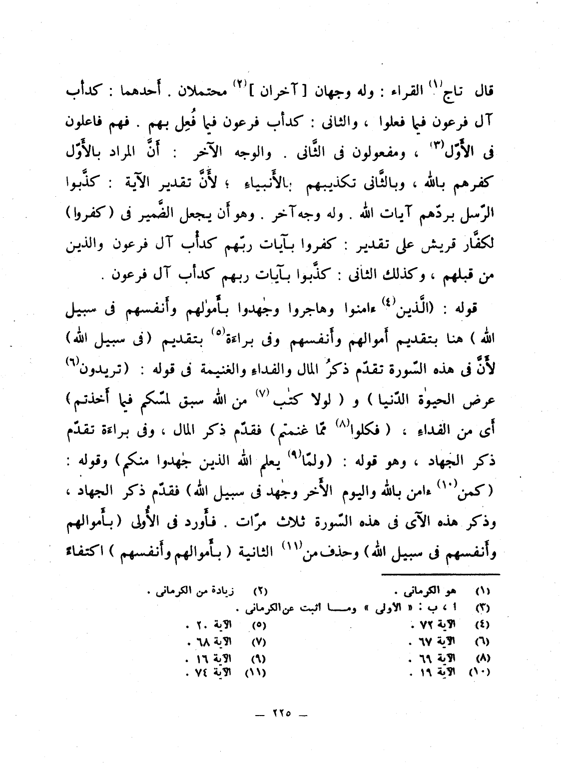 قوله: {الذين آمَنُواْ وَهَاجَرُواْ وَجَاهَدُواْ بِأَمْوَالِهِمْ وَأَنْفُسِهِمْ فِي سَبِيلِ الله} هنا بتقديم أَموالهم وأَنفسهم وفى براءَة بتقديم {فِي سَبِيْلِ اللهِ} لأَنَّ فى هذه السّورة تقدّم ذكرُ المال والفداءِ والغنيمة فى قوله: {تُرِيدُونَ عَرَضَ الدنيا} و {لَّوْلاَ كِتَابٌ مِّنَ الله سَبَقَ لَمَسَّكُمْ فِيمَآ أَخَذْتُمْ} أَى من الفداءِ، {فَكُلُواْ مِمَّا غَنِمْتُمْ} فقدّم ذكر المال، وفى براءَة تقدّم ذكر الجهاد، وهو قوله: {وَلَمَّا يَعْلَمِ الله الذين جَاهَدُواْ مِنكُمْ} وقوله: {كَمَنْ آمَنَ بالله واليوم الآخر وَجَاهَدَ فِي سَبِيلِ الله} فقدّم ذكر الجهاد، وذكر هذه الآى فى هذه السّورة ثلاث مرّات. فأَورد فى الأُولى {بِأَمْوَالِهِمْ وَأَنْفُسِهِمْ فِى سَبِيلِ اللهِ} وحذف من الثانية {بِأَمْوَالِهِمْ وَأَنْفُسِهِمْ} اكتفاءً