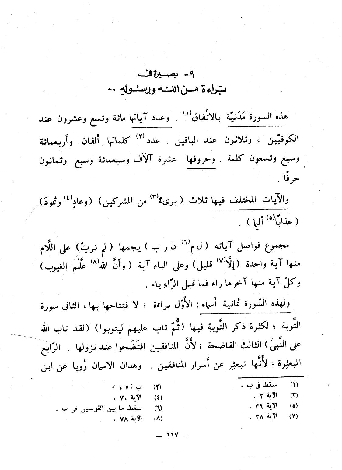 ولهذه السّورة ثمانية أَسماء: الأَوّل براءَة؛ لافتتاحها بها، الثانى سورة التَّوبة؛ لكثرة ذكر التَّوبة فيها {ثُمَّ تَابَ عَلَيْهِمْ لِيَتُوْبُواْ} {لَقَدْ تَّابَ اللهُ عَلَى النَّبِىِّ} الثالث الفاضحة؛ لأَنَّ المنافقين افتَضَحوا عند نزولها. الرّابع المبعثِرة؛ لأَنَّها تبعثِر عن أَسرار المنافقين. وهذان الاسمان رُويا عن ابن