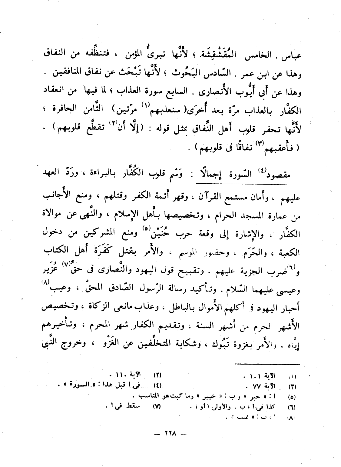 مقصود السّورة إِجمالاً: وَسْم قلوب الكُفَّار بالبراءَة، ورَدّ العهد عليهم، وأَمان مستمع القرآن، وقهر أَئمة الكفر وقتلهم، ومنع الأَجانب من عمارة المسجد الحرام، وتخصيصها بأَهل الإِسلام، والنَّهى عن موالاة الكفَّار، والإِشارة إِلى وقعة حرب حُنَيْن ومنع المشركين من دخول الكعبة، والحَرَم، وحضور الموسم، والأَمر بقتل كَفَرَة أَهل الكتاب وضرب الجزية عليهم، وتقبيح قول اليهود والنَّصارى فى حقِّ عُزَير وعيسى عليهما السّلام، وتأْكيد رسالة الرّسول الصّادق المحقّ، وعيب أَحبار اليهود فى أَكلهم الأَموال بالباطل، وعذاب مانعى الزكاة، وتخصيص الأَشهر الحرم من أَشهر السنة، وتقديم الكفار شهر المحرم، وتأخيرهم إِيَّاه، والأَمر بغزوة تَبُوك، وشكاية المتخلِّفين عن الغَزْو، وخروج النَّبى