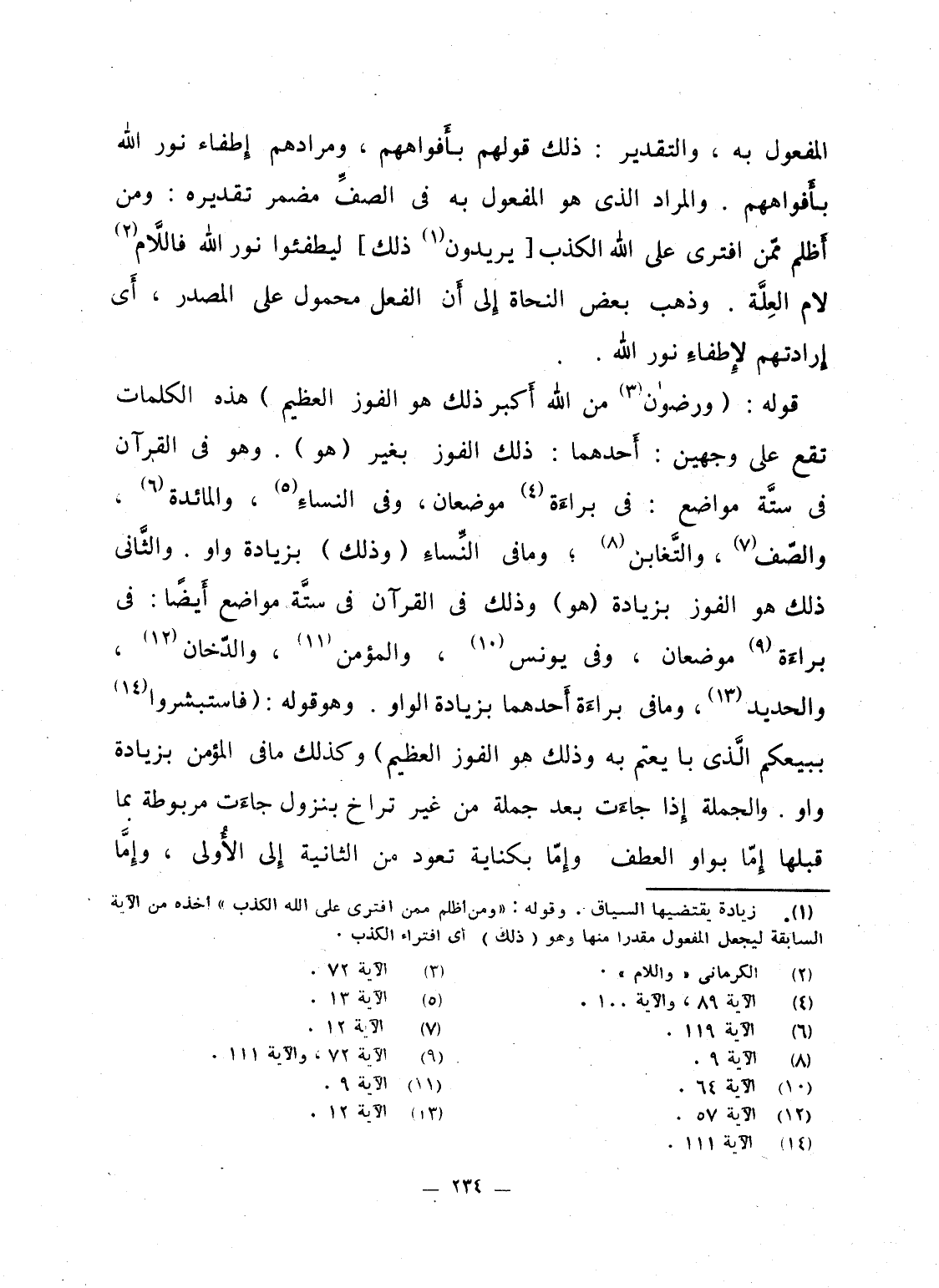المفعول به، والتقدير: ذلك قولهم بأَفواههم، ومرادهم إِطفاء نور الله بأَفواههم. والمراد الذى هو المفعول به فى الصفِّ مضمر تقديره: ومن أَظلم ممّن افترى على الله الكذب [يريدون ذلك] ليطفئوا نور الله فالَّلام لام العِلَّة. وذهب بعض النحاة إِلى أَن الفعل محمول على المصدر. أَى إِرادتهم لإِطفاءِ نور الله.