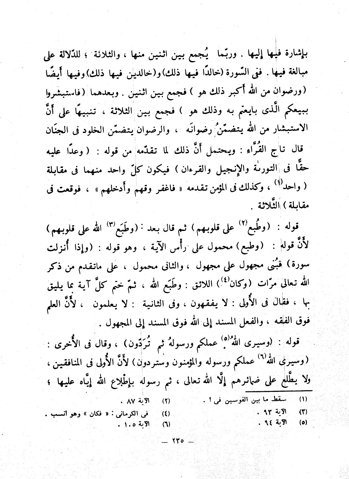قوله: {وَطُبِعَ على قُلُوبِهِمْ} ثم قال بعد: {وَطَبَعَ الله على قُلُوبِهِمْ} لأَنَّ قوله: (وطبع) محمول على رأْس الآية، وهو قوله: {وَإِذَا أُنْزِلَتْ سُوْرَةٌ} فبُنى مجهول على مجهول، والثانى محمول، على ما تقدم من ذكر الله تعالى مرّات (وكان) اللائق: وطَبَع الله، ثمّ ختم كلَّ آية بما يليق بها، فقال فى الأُولى: لا يفقهون، وفى الثانية: لا يعلمون، لأَنَّ العلم فوق الفقه، والفعل المسند إِلى الله فوق المسند إِلى المجهول.