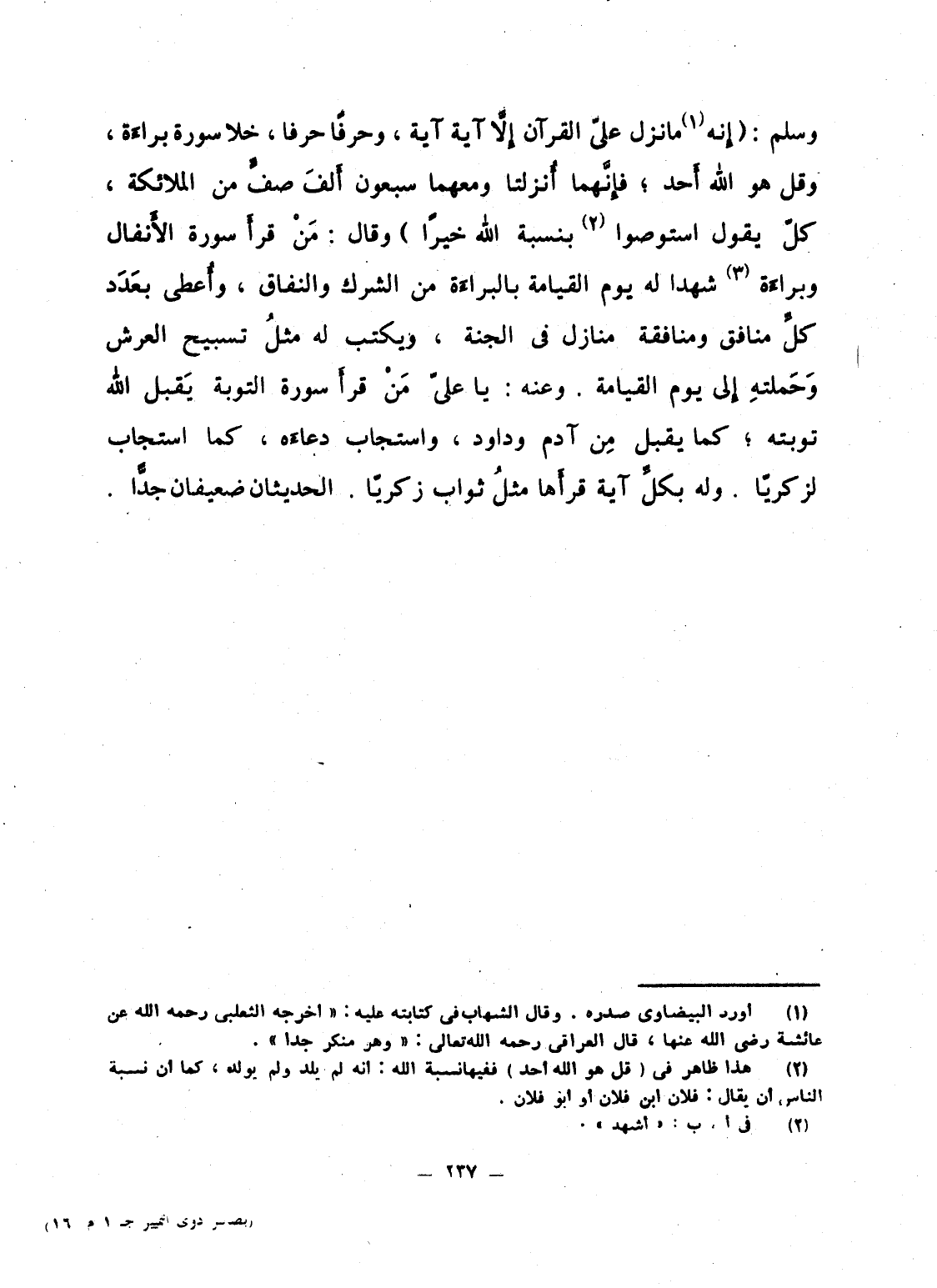 وسلم: "إِنه ما نزل علىّ القرآن إِلاَّ آية آية، وحرفاً حرفا، خلا سورة براءَة، وقل هو الله أَحد؛ فإِنَّهما أُنزلتا ومعهما سبعون أَلفَ صفٍّ من الملائكة، كلّ يقول استوصوا بنسبة الله خيراً" وقال: مَنْ قرأَ سورة الأَنفال وبراءَة شهدا له يوم القيام بالبراءَة من الشرك والنفاق، وأُعطى بعَدَد كلِّ منافق ومنافقة منازل فى الجنة، ويكتب له مثلُ تسبيح العرش وَحَملتهِ إِلى يوم القيامة. وعنه: يا علىّ مَنْ قرأَ سورة التوبة يَقبل الله توبته؛ كما يقبل مِن آدم وداود، واستجاب دعاءَه، كما استجاب لزكريّا. وله بكلِّ آية قرأَها مثلُ ثواب زكريّا. الحديثان ضعيفان جدّاً.