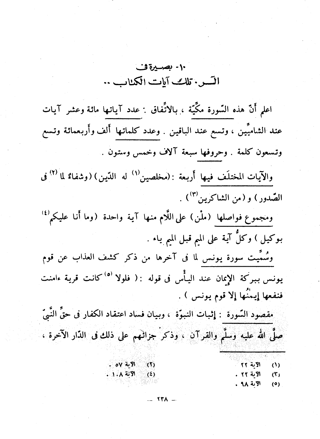 والآيات المختلَف فيها أَربعة: {مُخْلِصِينَ لَهُ الدين} {وَشِفَآءٌ لِّمَا فِي الصدور} و {مِنَ الشَّاكِرِيْنَ} .