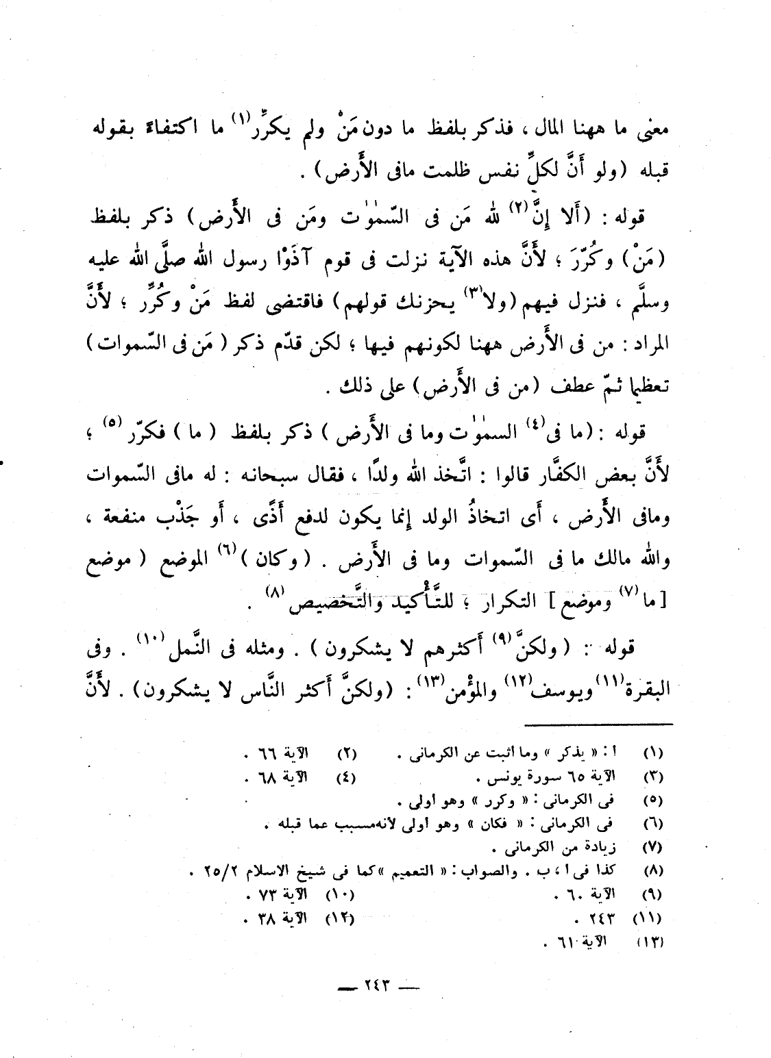 قوله: {ألا إِنَّ للَّهِ مَن فِي السماوات وَمَنْ فِي الأرض} ذكر بلفظ (مَنْ) وكُرّرَ؛ لأَنَّ هذه الآية نزلت فى قوم آذَوْا رسول الله صلَّى الله عليه وسلَّم، فنزل فيهم {وَلاَ يَحْزُنْكَ قَوْلُهُمْ} فاقتضى لفظ مَنْ وكُرِّر؛ لأَنَّ المراد: من فى الأَرض هاهنا لكونهم فيها؛ لكن قدّم ذكر (مَن فى السّماوات) تعظيماً ثمّ عطف (من فى الأَرض) على ذلك.
