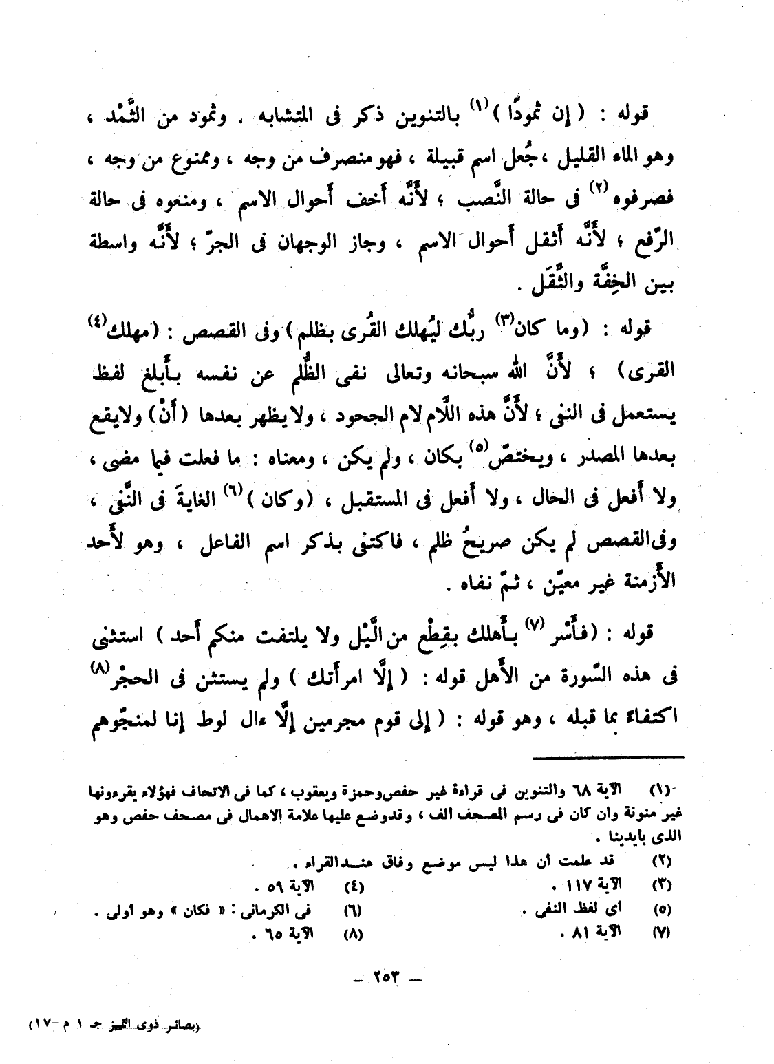 قوله: {إِنَّ ثَمُوْدًا} بالتنوين ذكر فى المتشابه. وثمود من الثَّمْد، وهو الماء القليل، جُعل اسم قبيلة، فهو منصرف من وجه، وممنوع من وجه، فصرفوه فى حالة النَّصب؛ لأَنَّه أَخف أَحوال الاسم، ومنعوه فى حالة الرّفع؛ لأَنَّه أَثقل أَحوال الاسم، وجاز الوجهان فى الجرّ؛ لأَنَّه واسطة بين الخِفَّة والثِّقَل.