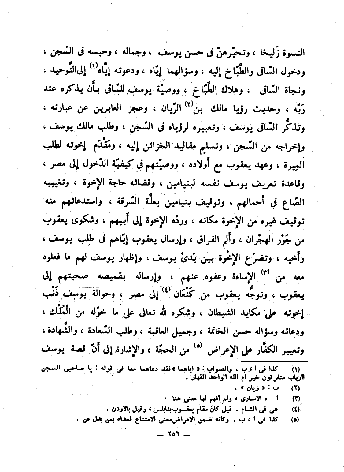 النسوة زَليخا، وتحيّرهنّ فى حسن يوسف، وجماله، وحبسه فى السّجن، ودخول السّاقى والطَّبّاخ إِليه، وسؤالهما إِيّاه، ودعوته إِيَّاه إِلى التَّوحيد، ونجاة السّاقى، وهلاك الطَّبّاخ، ووصيّة يوسف للسّاقى بأَن يذكره عند رَبّه، وحديث رؤيا مالك بن الرّيان، وعجز العابرين عن عبارته، وتذكُّر السّاقى يوسف، وتعبيره لرؤياه فى السّجن، وطلب مالك يوسف، وإِخراجه من السّجن، وتسليم مقاليد الخزائن إِليه، ومَقْدَم إِخوته لطلب المِيرة، وعهد يعقوب مع أَولاده، ووصيّتهم فى كيفيّة الدّخول إِلى مصر، وقاعدة تعريف يوسف نفسه لبنيامين، وقضائه حاجة الإِخوة، وتغييبه الصّاع فى أَحمالهم، وتوقيف بنيامين بعلَّة السّرقة، واستدعائهم منه توقيف غيره من الإِخوة مكانه، وردّه الإِخوة إِلى أَبيهم، وشكوى يعقوب من جَوْر الهجْران، وأَلم الفراق، وإِرسال يعقوب إِيّاهم فى طلب يوسف، وأَخيه، وتضرّع الإِخْوة بين يَدىْ يوسف، وإِظهار يوسف لهم ما فعلوه معه من الإِساءَة وعفوه عنهم، وإِرساله بقميصه صحبتهم إِلى يعقوب، وتوجُّه يعقوب من كَنْعَان إِلى مصر، وحوالة يوسف ذَنْب إِخوته على مكايد الشيطان، وشكره لله تعالى على ما خوّله من الْمُلْك، ودعائه وسؤاله حسن الخاتمة، وجميل العاقبة، وطلب السّعادة، والشَّهادة، وتعيير الكفَّار على الإِعراض من الحجّة، والإِشارة إِلى أَنّ قصة يوسف