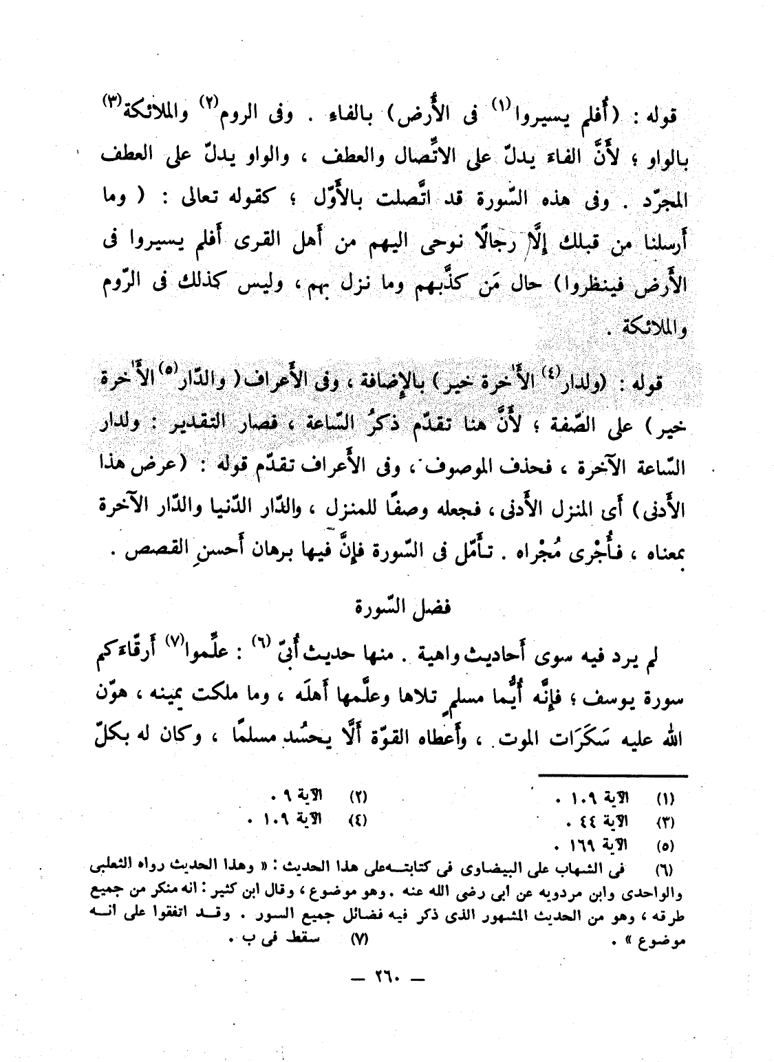 قوله: {وَلَدَّارُ الآخرة خَيْرٌ} بالإِضافة، وفى الأَعراف {والدار الآخرة خَيْرٌ} على الصّفة؛ لأَنَّ هنا تقدّم ذكرُ السّاعة، فصار التقدير: ولدار السّاعة الآخرة، فحذف الموصوف، وفى الأَعراف تقدّم قوله: {عَرَضَ هاذا الأدنى} أَى المنزل الأَدنى، فجعله وصفاً للمنزل، والدّار الدّنيا والدّار الآخرة بمعناه، فأُجْرى مُجْراه. تأَمّل فى السّورة فإِنَّ فيها برهان أَحسنِ القصص.