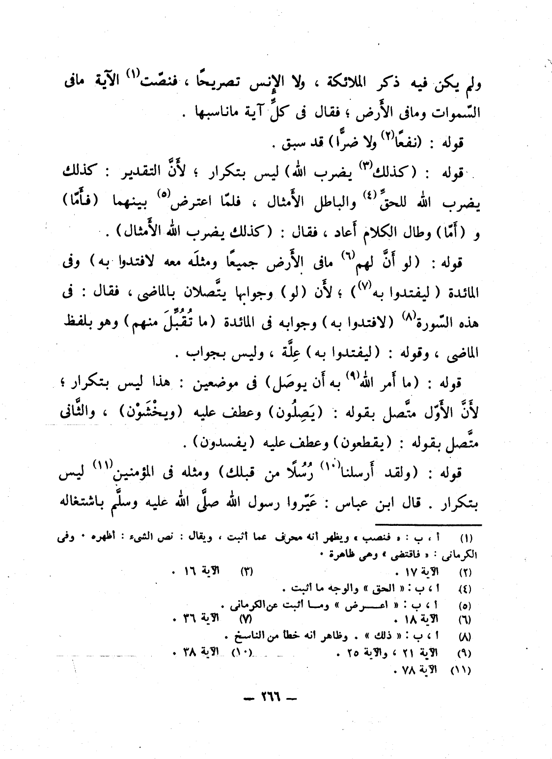 ولم يكن فيه ذكر الملائكة، ولا الإِنس تصريحاً، فنصّت الآية ما فى السّماوات وما فى الأَرض؛ فقال فى كلِّ آية ما ناسبها.