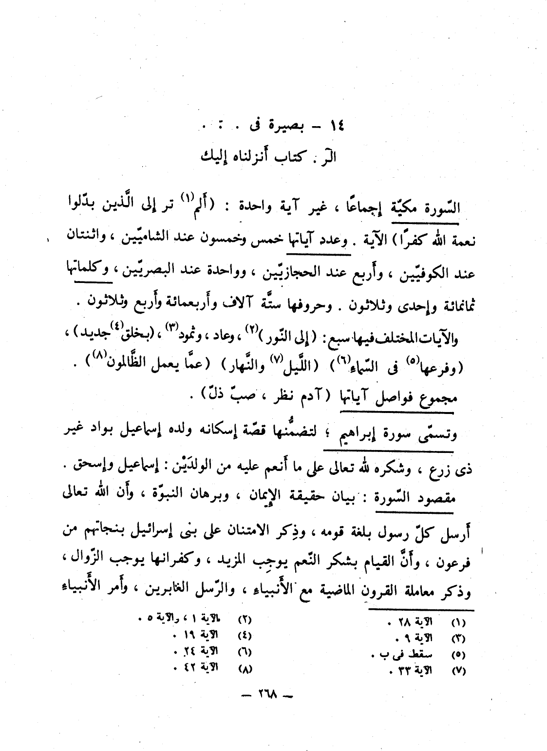 مقصود السّورة: بيان حقيقة الإِيمان، وبرهان النبوّة، وأَن الله تعالى أَرسل كلّ رسول بلغة قومه، وذِكر الامتنان على بنى إِسرائيل بنجاتهم من فرعون، وأَنَّ القيام بشكر النّعم يوجِب المزيد، وكفرانها يوجب الزّوال، وذكر معاملة القرون الماضية مع الأَنبياءِ، والرّسل الغابرين، وأَمر الأَنبياءِ