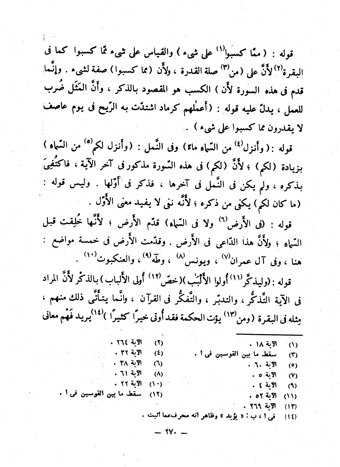 قوله: {مِمَّا كَسَبُواْ على شَيْءٍ} والقياس على شىء ممّا كسبوا كما فى البقرة لأَنَّ على (من صلة القدرة، ولأَن (مما كسبوا) صف لشىء. وإِنَّما قدم فى هذه السورة لأَن) الكسب هو المقصود بالذكر، وأَنَّ المَثَل ضُرب للعمل، يدلّ عليه قوله: {أَعْمَالُهُمْ كَرَمَادٍ اشتدت بِهِ الريح فِي يَوْمٍ عَاصِفٍ لاَّ يَقْدِرُونَ مِمَّا كَسَبُواْ على شَيْءٍ} .