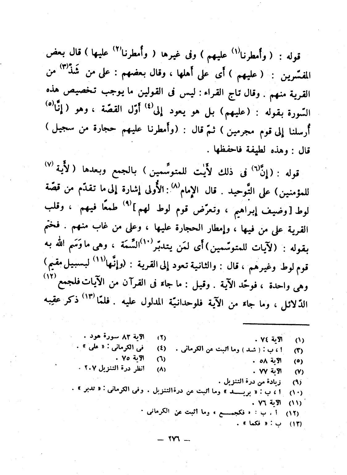 قوله: {وَأَمْطَرْنَا عَلَيْهِمْ} وفى غيرها {وَأَمْطَرْنَا عَلَيْهَا} قال بعض المفسّرين: (عليهم) أَى على أَهلها، وقال بعضهم: على من شَذّ من القرية منهم. وقال تاج القراء: ليس فى القولين ما يوجب تخصيص هذه السّورة بقوله: (عليهم) بل هو يعود إِلى أَوّل القصّة، وهو {إِنَّآ أُرْسِلْنَآ إلى قَوْمٍ مُّجْرِمِينَ} ثمّ قال: {وَأَمْطَرْنَا عَلَيْهِمْ حِجَارَةً مِّن سِجِّيلٍ} قال: وهذه لطيفة فاحفظها.