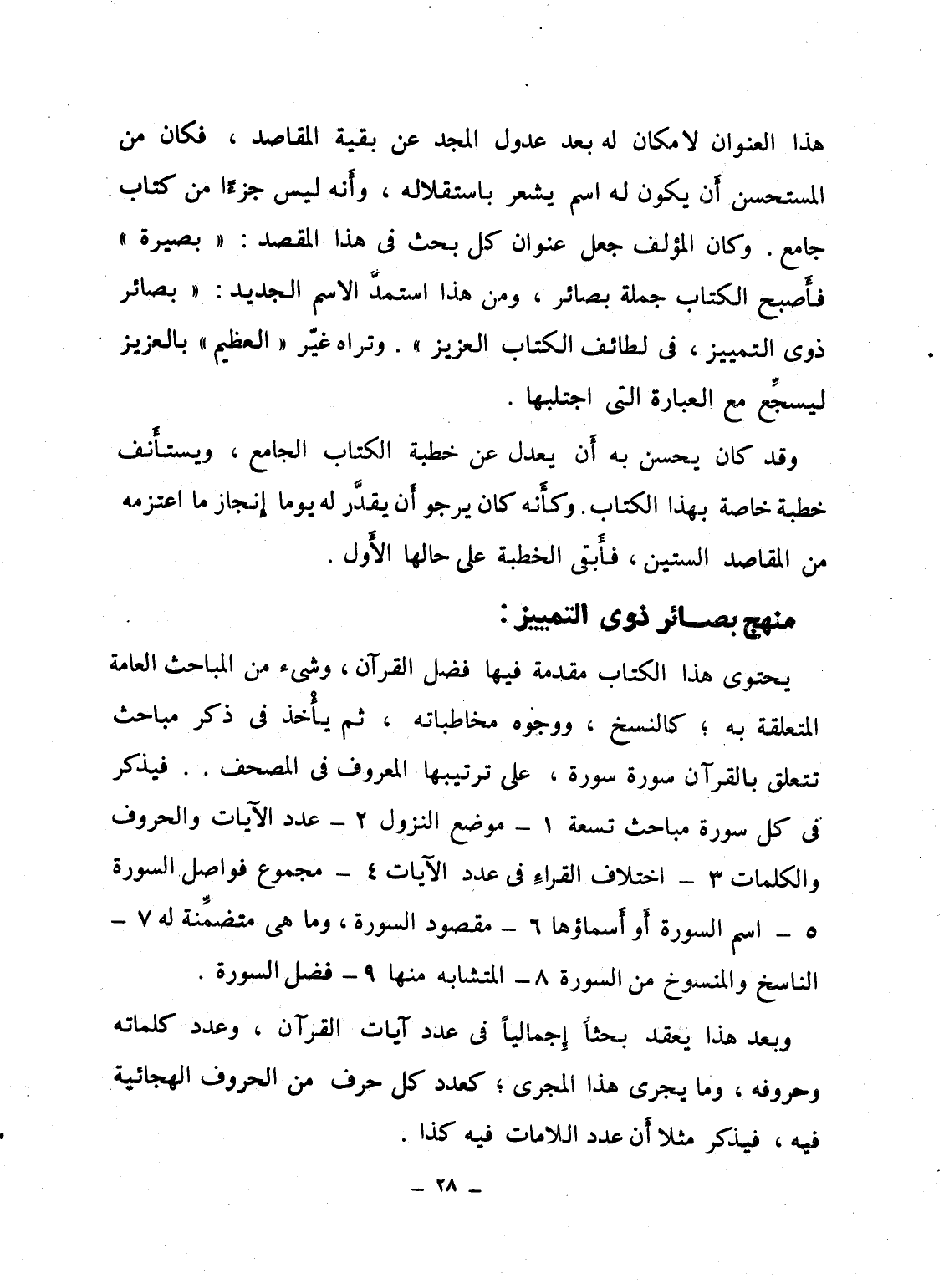 هذا العنوان لا مكان له بعد عدول المجد عن بقية المقاصد، فكان من المستحسن أَن يكون له اسم يشعر باستقلاله، وأَنه ليس جزءًا من كتاب جامع. وكان المؤلف جعل عنوان كل بحث فى هذا المقصد: "بصيرة" فأَصبح الكتاب جملة بصائر، ومن هذا استمدَّ الاسم الجديد: "بصائر ذوى التمييز، فى لطائف الكتاب العزيز". وتراه غيّر "العظيم" بالعزيز ليسجِّع مع العبارة التى اجتلبها.