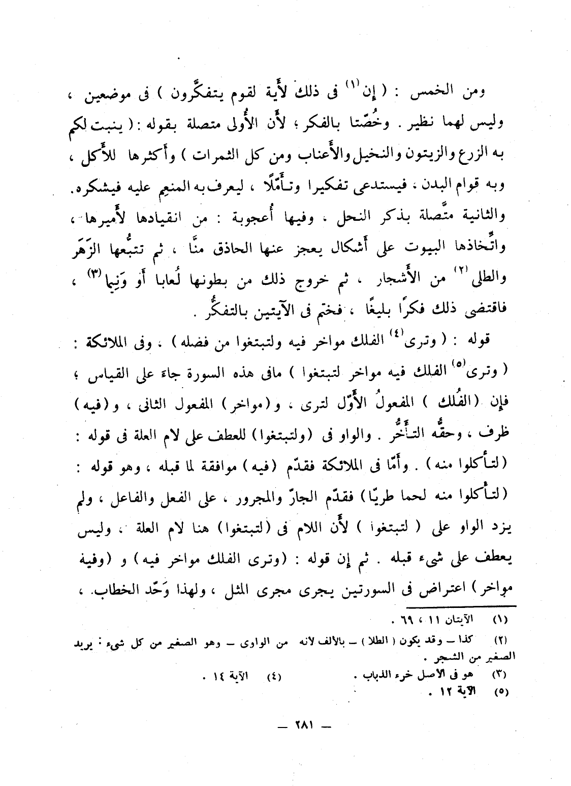 ومن الخمس: {إِنَّ فِي ذَلِكَ لآيَةً لِّقَوْمٍ يَتَفَكَّرُونَ} فى موضعين، وليس لهما نظير. وخُصّتا بالفكر؛ لأَن الأُولى متصلة بقوله: {يُنبِتُ لَكُمْ بِهِ الزرع والزيتون والنخيل والأعناب وَمِن كُلِّ الثمرات} وأَكثرها للأَكل، وبه قوام البدن، فيستدعى تفكيراً وتأَمّلاً، ليعرف به المنعِم عليه فيشكره. والثانية متَّصلة بذكر النحل، وفيها أُعجوبة: من انقيادها لأَميرها، واتِّخاذها البيوت على أَشكال يعجز عنها الحاذق منَّا، ثم تتبُّعها الزَهَر والطلى من الأَشجار، ثم خروج ذلك من بطونها لُعابا أَو وَنِيما، فاقتضى ذلك فكراً بليغاً، فختم فى الآيتين بالتفكُّر.